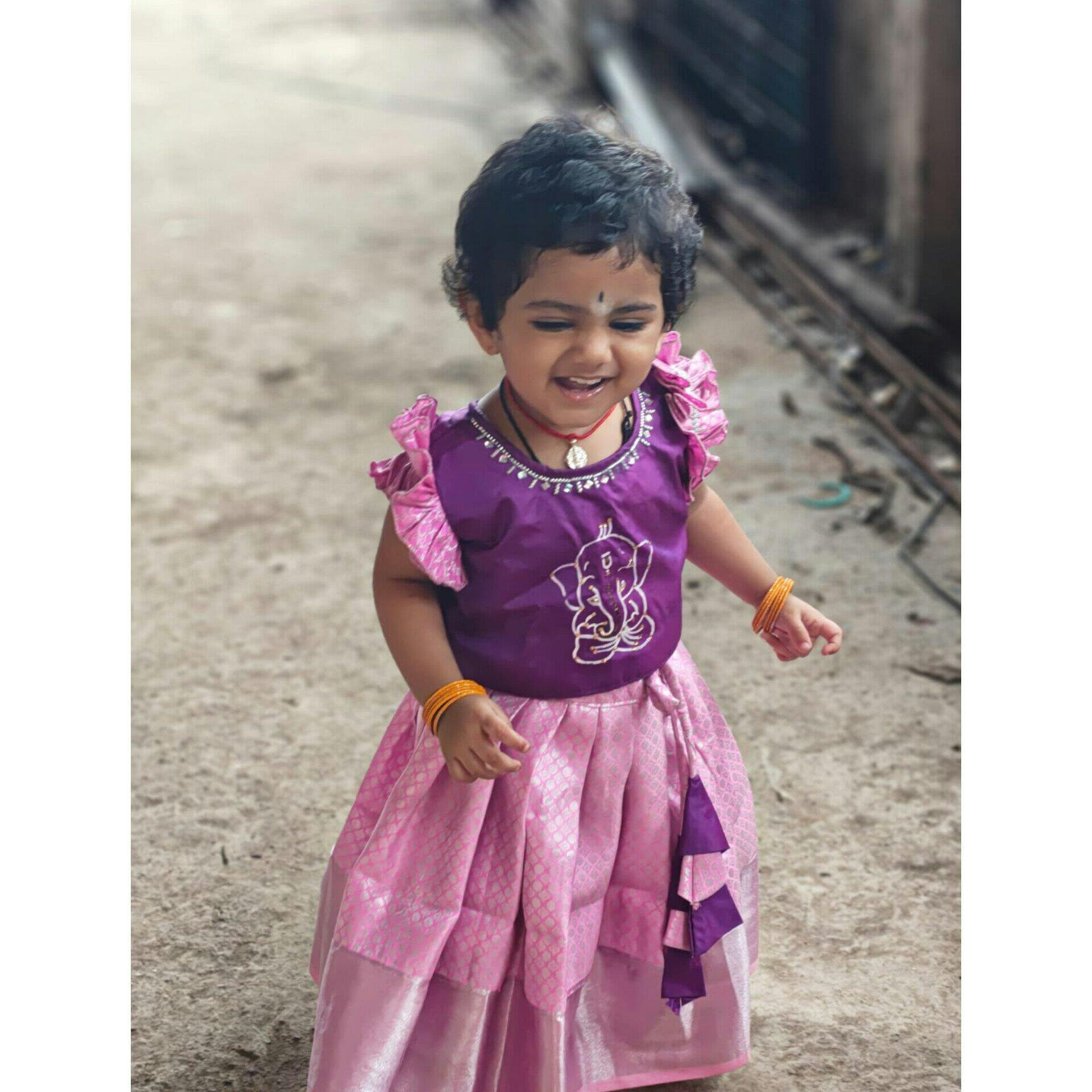This pattu pavada is absolutely adorable! The purple and pink combination looks so vibrant and traditional. The fabric has a lovely shine, and the design is perfect for festive occasions. It fits comfortably and allows easy movement—my little one looked so happy and confident wearing it. Truly a beautiful and elegant outfit for kids.