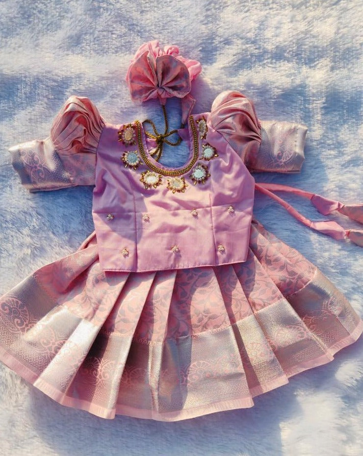 Pattu Pavadai is a traditional dress of South India. The paavadai or langa is a cone-shaped, long skirt that is pleated and tied around the waist, normally made of silk, that hangs down from the waist to the toes.