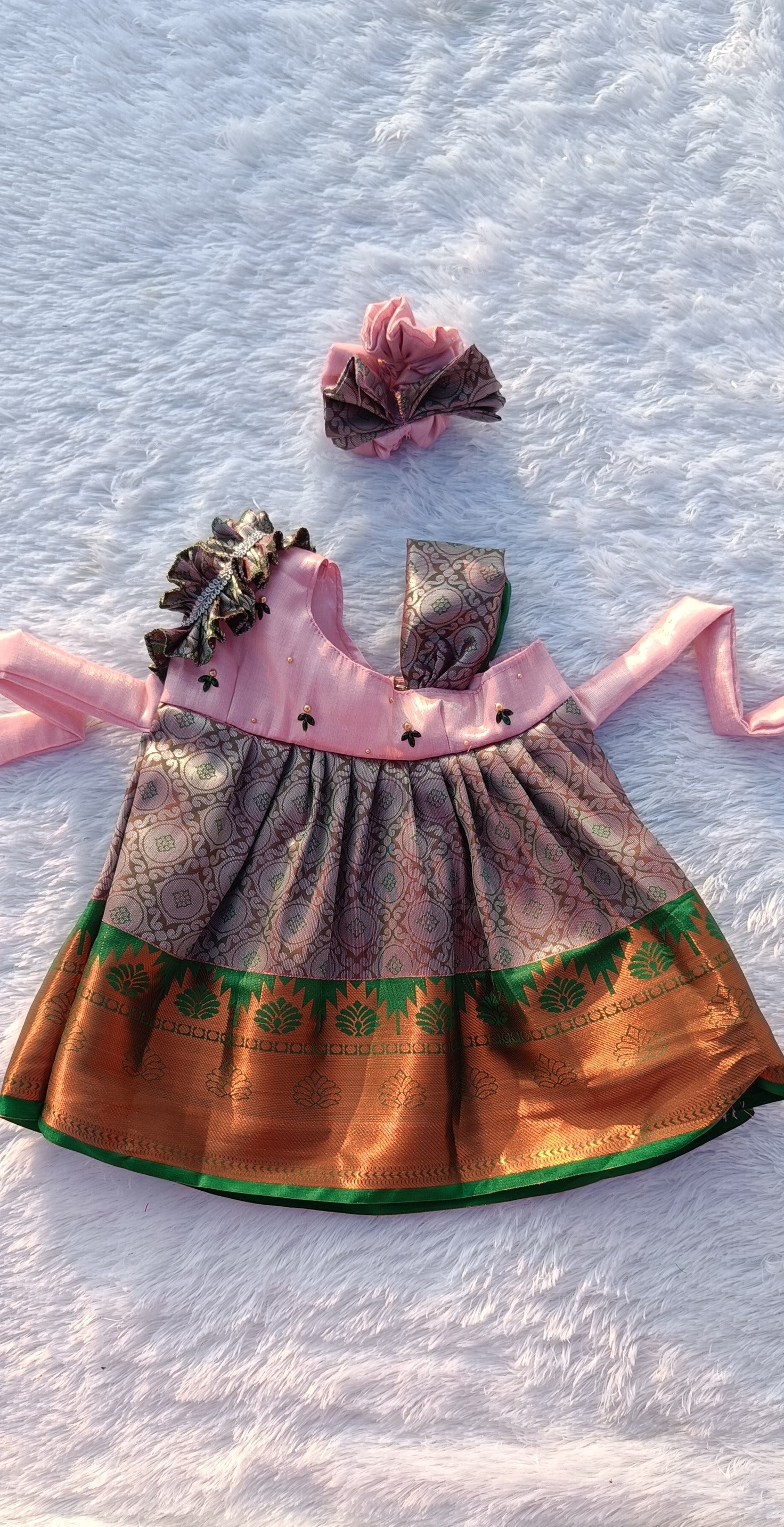 Pattu Pavadai is a traditional dress of South India. The paavadai or langa is a cone-shaped, long skirt that is pleated and tied around the waist, normally made of silk, that hangs down from the waist to the toes.