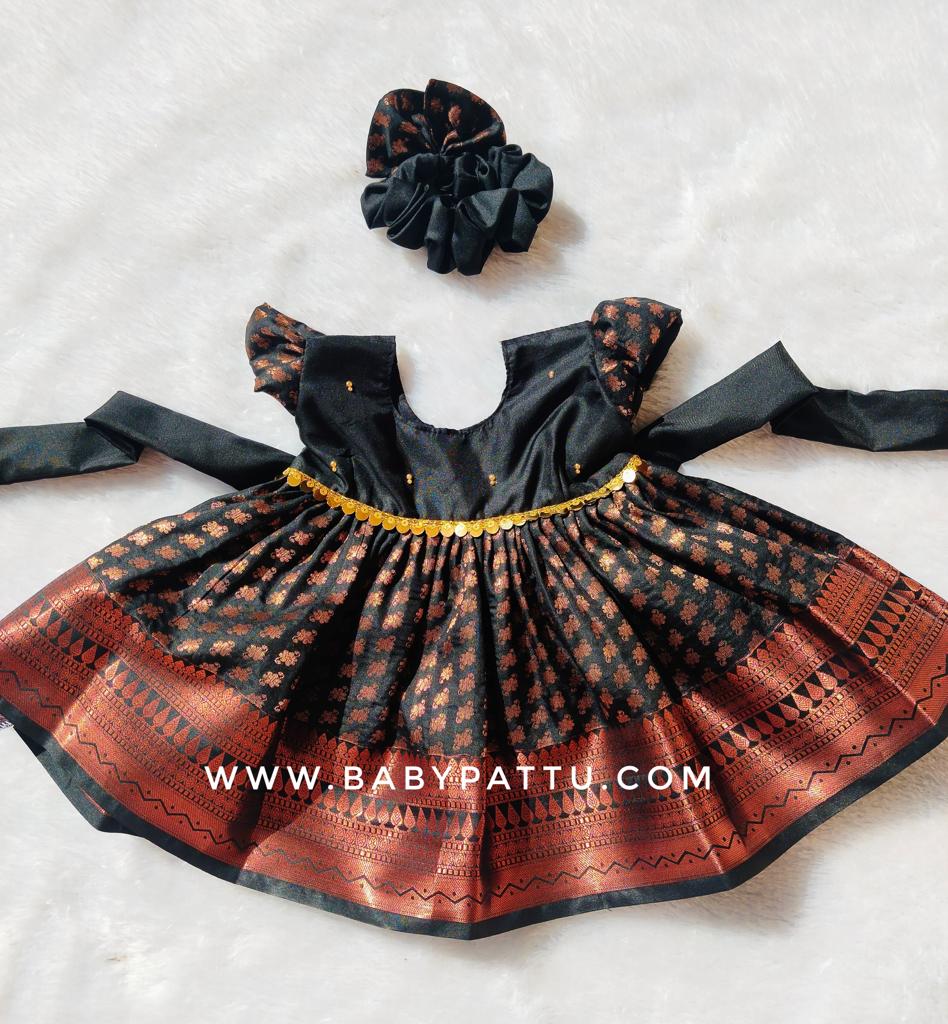 Pattu Pavadai is a traditional dress of South India. The paavadai or langa is a cone-shaped, long skirt that is pleated and tied around the waist, normally made of silk, that hangs down from the waist to the toes.