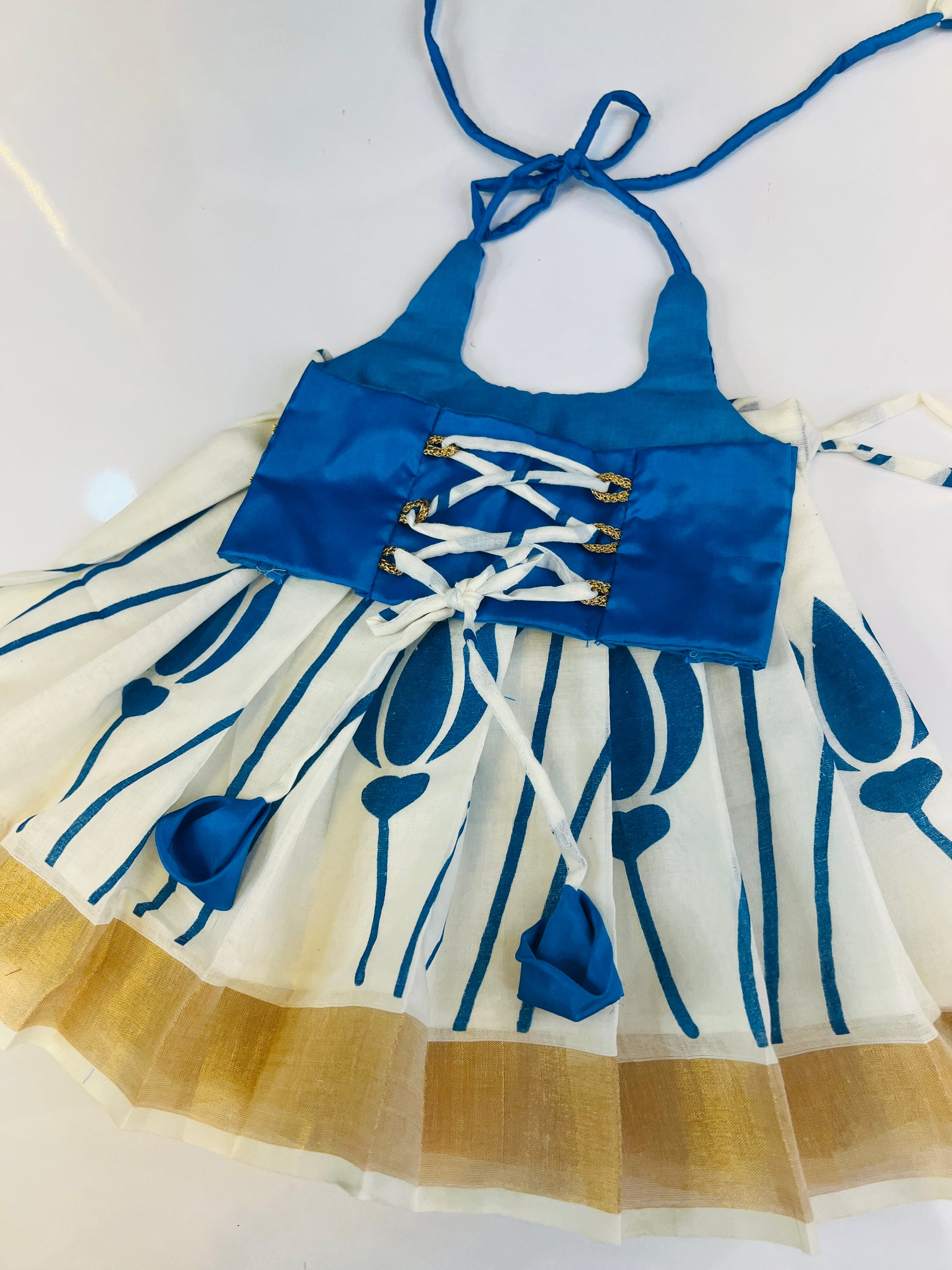 Blue Color Crop Top And Kerala Cotton Bottom Pattu pavada Onam 2025 collections