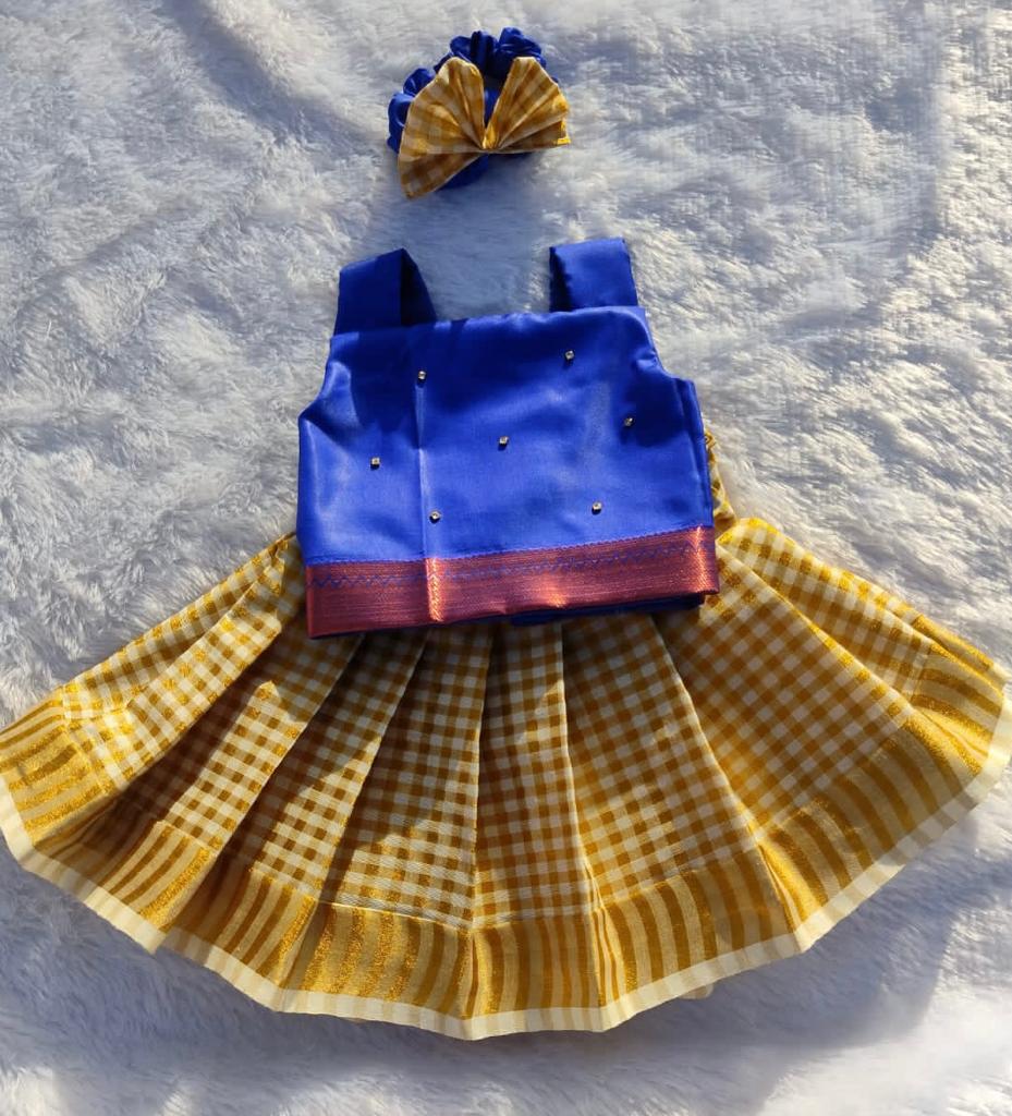 Pattu Pavadai is a traditional dress of South India. The paavadai or langa is a cone-shaped, long skirt that is pleated and tied around the waist, normally made of silk, that hangs down from the waist to the toes.