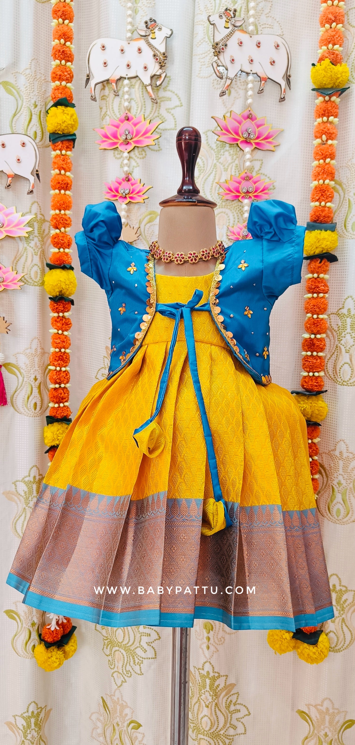 Pattu Pavadai is a traditional dress of South India. The paavadai or langa is a cone-shaped, long skirt that is pleated and tied around the waist, normally made of silk, that hangs down from the waist to the toes.