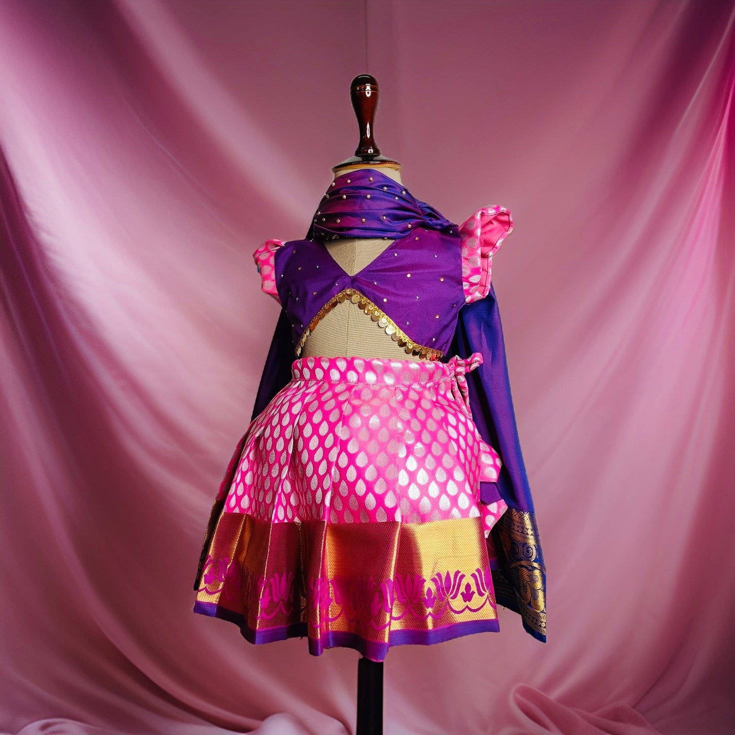 Pattu Pavadai is a traditional dress of South India. The paavadai or langa is a cone-shaped, long skirt that is pleated and tied around the waist, normally made of silk, that hangs down from the waist to the toes.