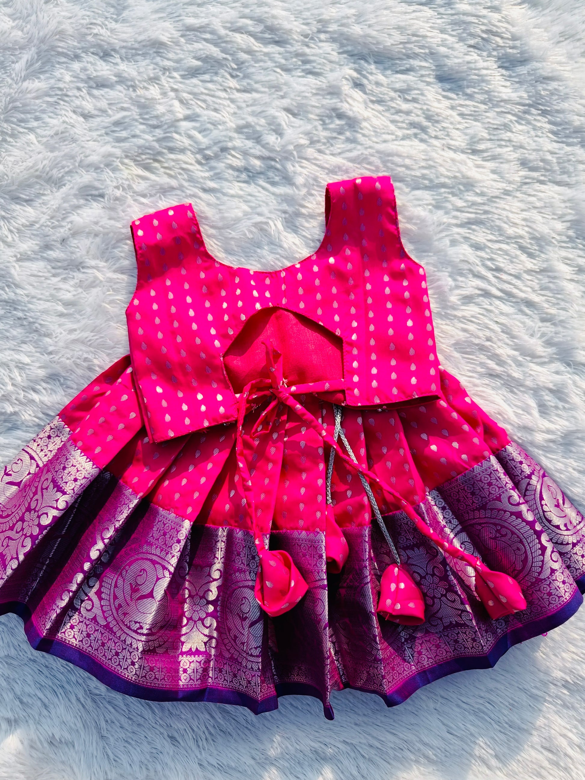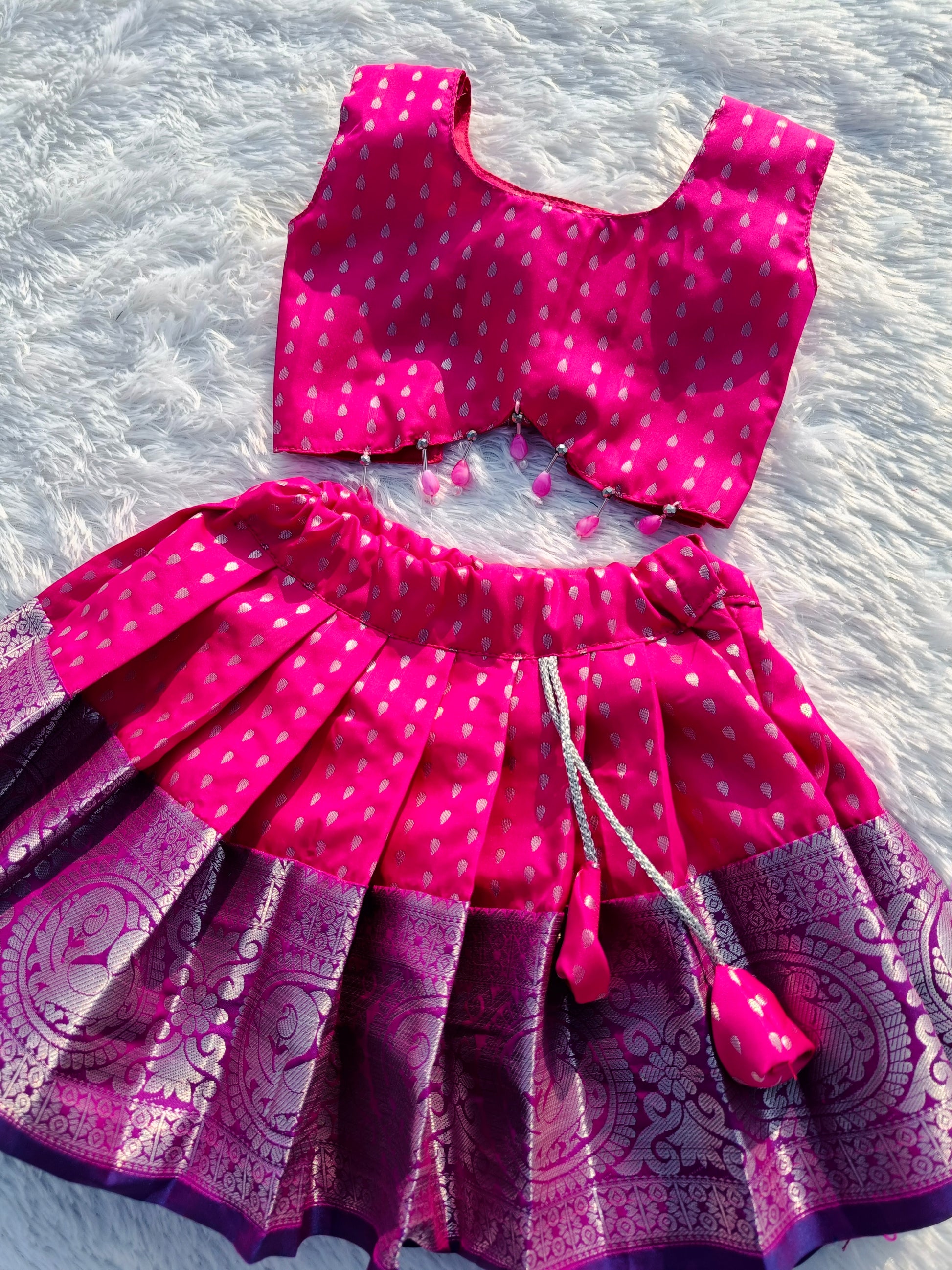 Pattu Pavadai is a traditional dress of South India. The paavadai or langa is a cone-shaped, long skirt that is pleated and tied around the waist, normally made of silk, that hangs down from the waist to the toes.