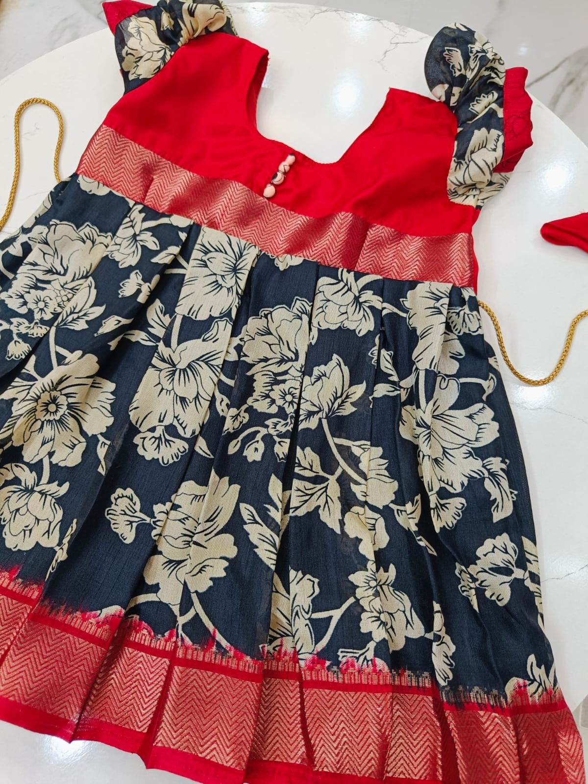 Pattu Pavadai is a traditional dress of South India. The paavadai or langa is a cone-shaped, long skirt that is pleated and tied around the waist, normally made of silk, that hangs down from the waist to the toes.