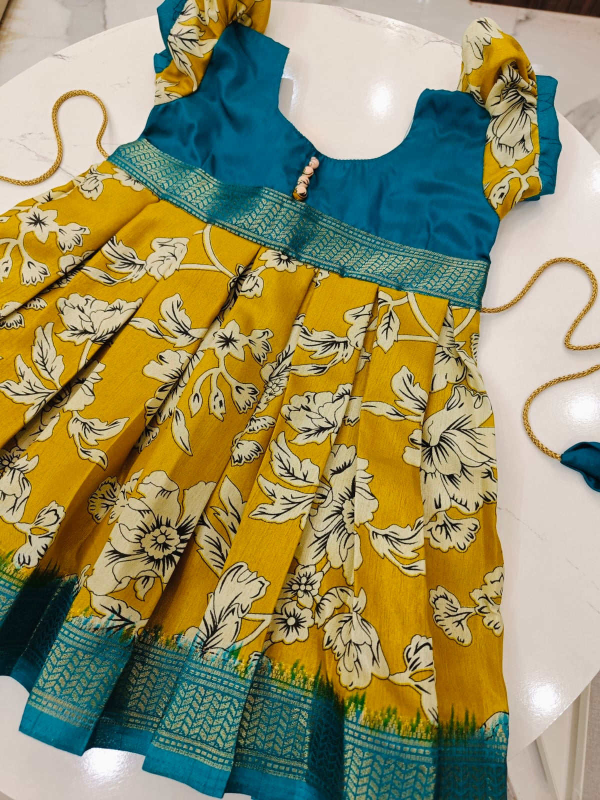 Double Shade Green and Mustard Yellow Floral Print Dola Silk Frock