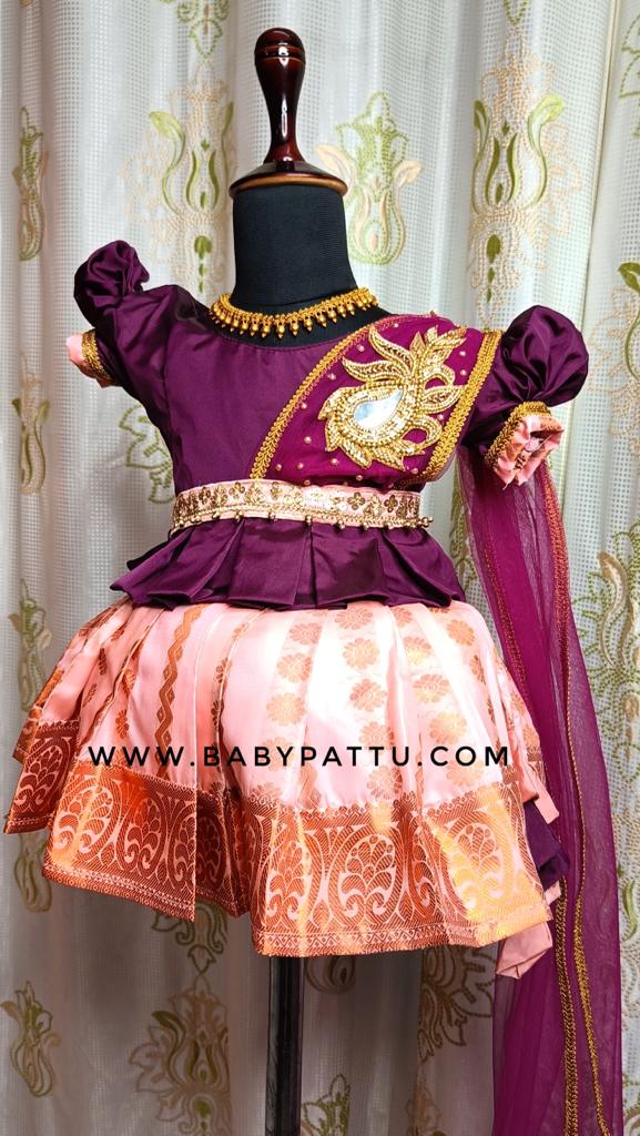 Pattu Pavadai is a traditional dress of South India. The paavadai or langa is a cone-shaped, long skirt that is pleated and tied around the waist, normally made of silk, that hangs down from the waist to the toes.
