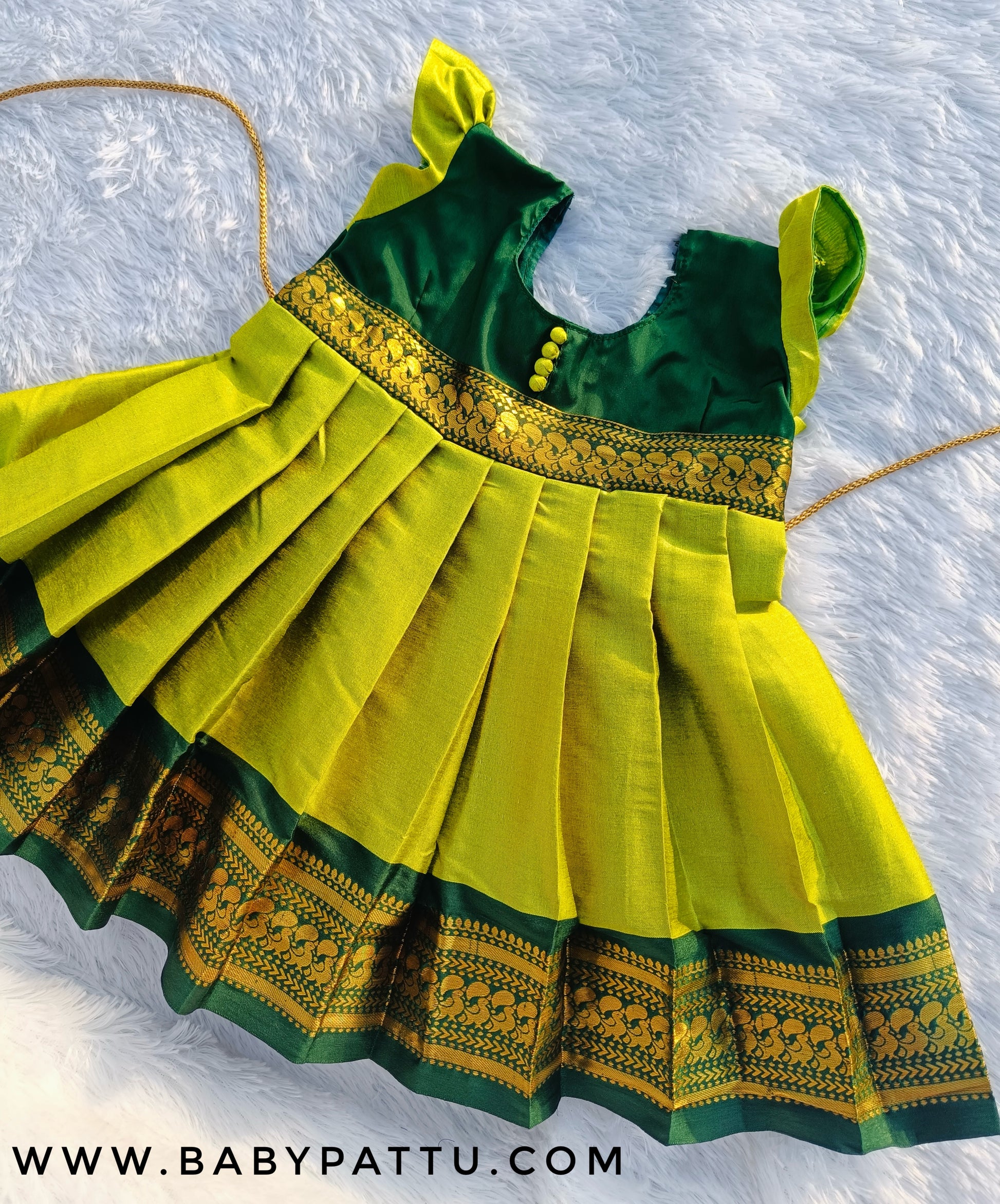 Pattu Pavadai is a traditional dress of South India. The paavadai or langa is a cone-shaped, long skirt that is pleated and tied around the waist, normally made of silk, that hangs down from the waist to the toes.