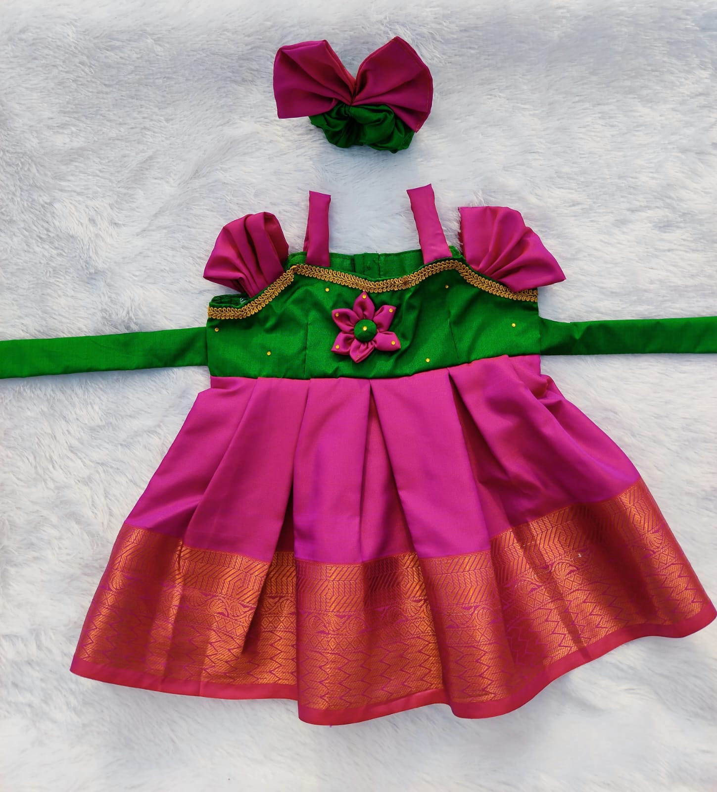 Pattu Pavadai is a traditional dress of South India. The paavadai or langa is a cone-shaped, long skirt that is pleated and tied around the waist, normally made of silk, that hangs down from the waist to the toes.