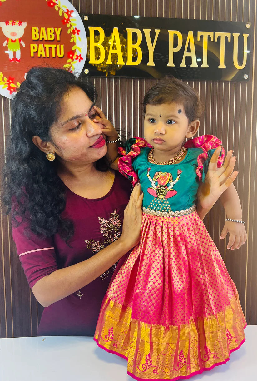 Pattu Pavadai is a traditional dress of South India. The paavadai or langa is a cone-shaped, long skirt that is pleated and tied around the waist, normally made of silk, that hangs down from the waist to the toes.
