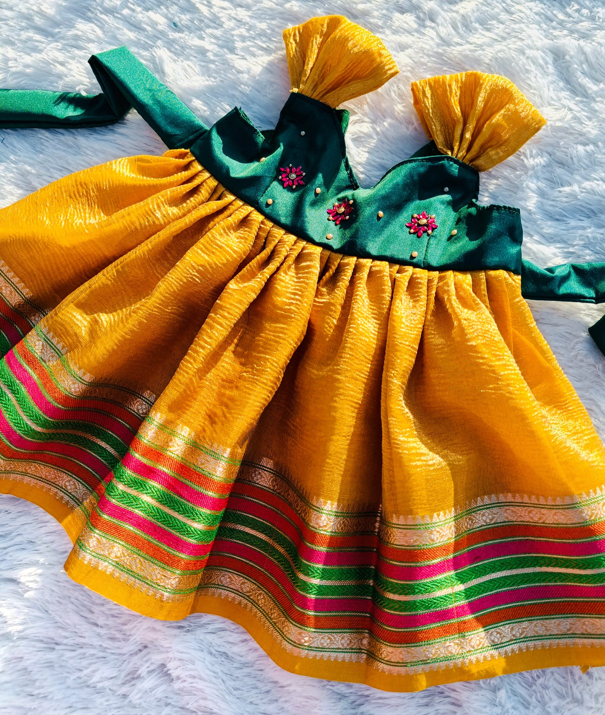 Pattu Pavadai is a traditional dress of South India. The paavadai or langa is a cone-shaped, long skirt that is pleated and tied around the waist, normally made of silk, that hangs down from the waist to the toes.
