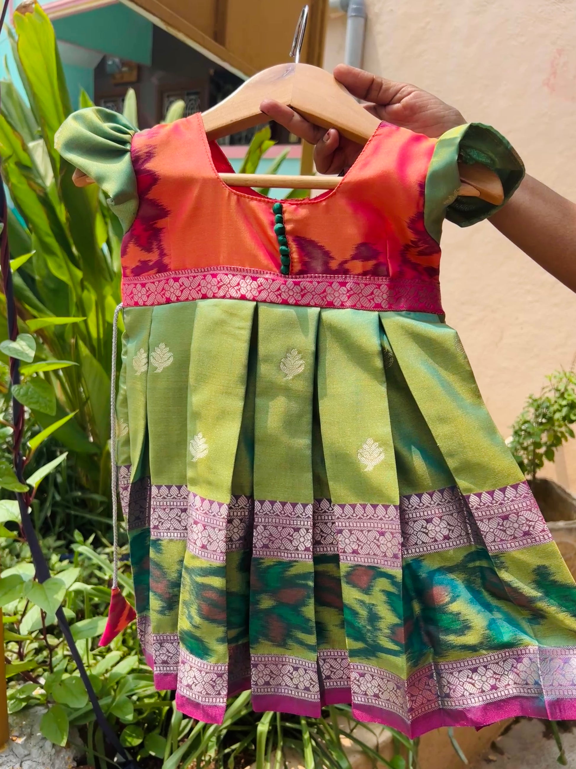 Pattu Pavadai is a traditional dress of South India. The paavadai or langa is a cone-shaped, long skirt that is pleated and tied around the waist, normally made of silk, that hangs down from the waist to the toes.