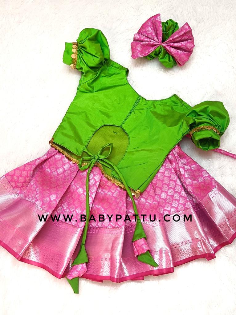 Pattu Pavadai is a traditional dress of South India. The paavadai or langa is a cone-shaped, long skirt that is pleated and tied around the waist, normally made of silk, that hangs down from the waist to the toes.