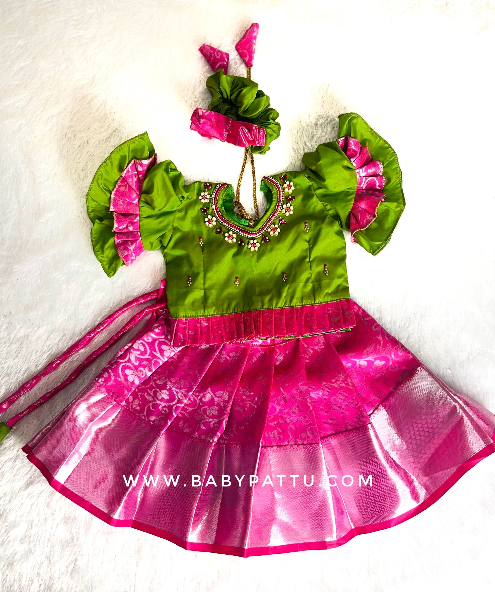 Pattu Pavadai is a traditional dress of South India. The paavadai or langa is a cone-shaped, long skirt that is pleated and tied around the waist, normally made of silk, that hangs down from the waist to the toes.