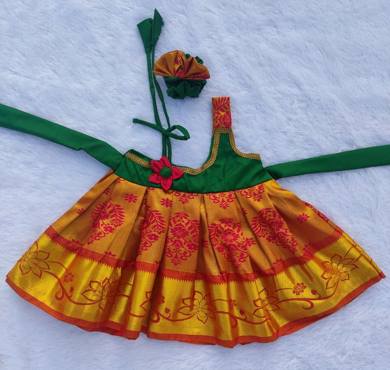 Pattu Pavadai is a traditional dress of South India. The paavadai or langa is a cone-shaped, long skirt that is pleated and tied around the waist, normally made of silk, that hangs down from the waist to the toes.