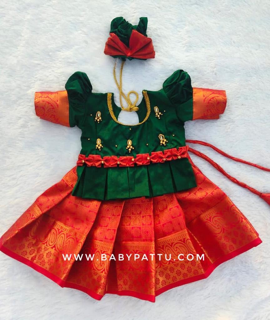 Pattu Pavadai is a traditional dress of South India. The paavadai or langa is a cone-shaped, long skirt that is pleated and tied around the waist, normally made of silk, that hangs down from the waist to the toes.