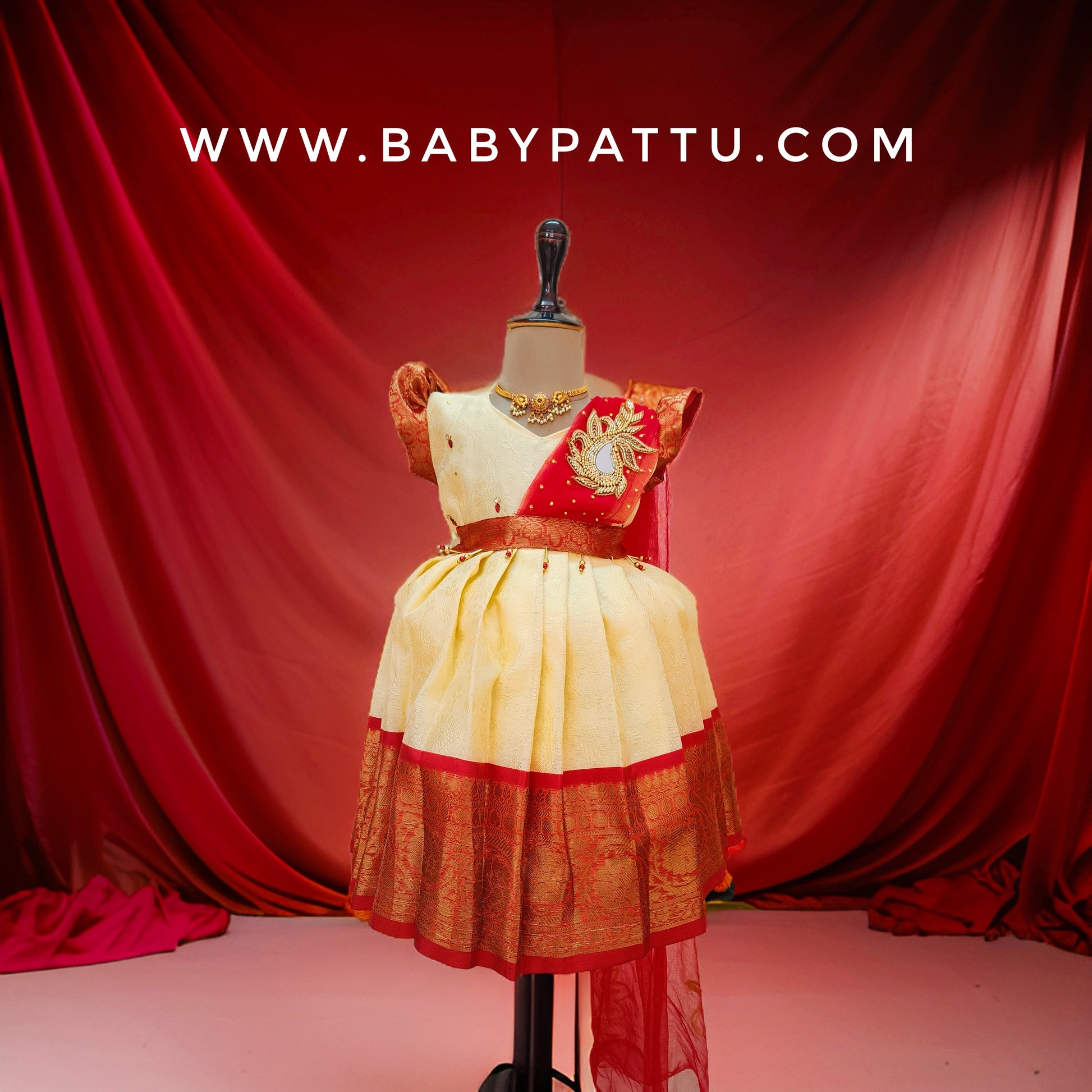Pattu Pavadai is a traditional dress of South India. The paavadai or langa is a cone-shaped, long skirt that is pleated and tied around the waist, normally made of silk, that hangs down from the waist to the toes.