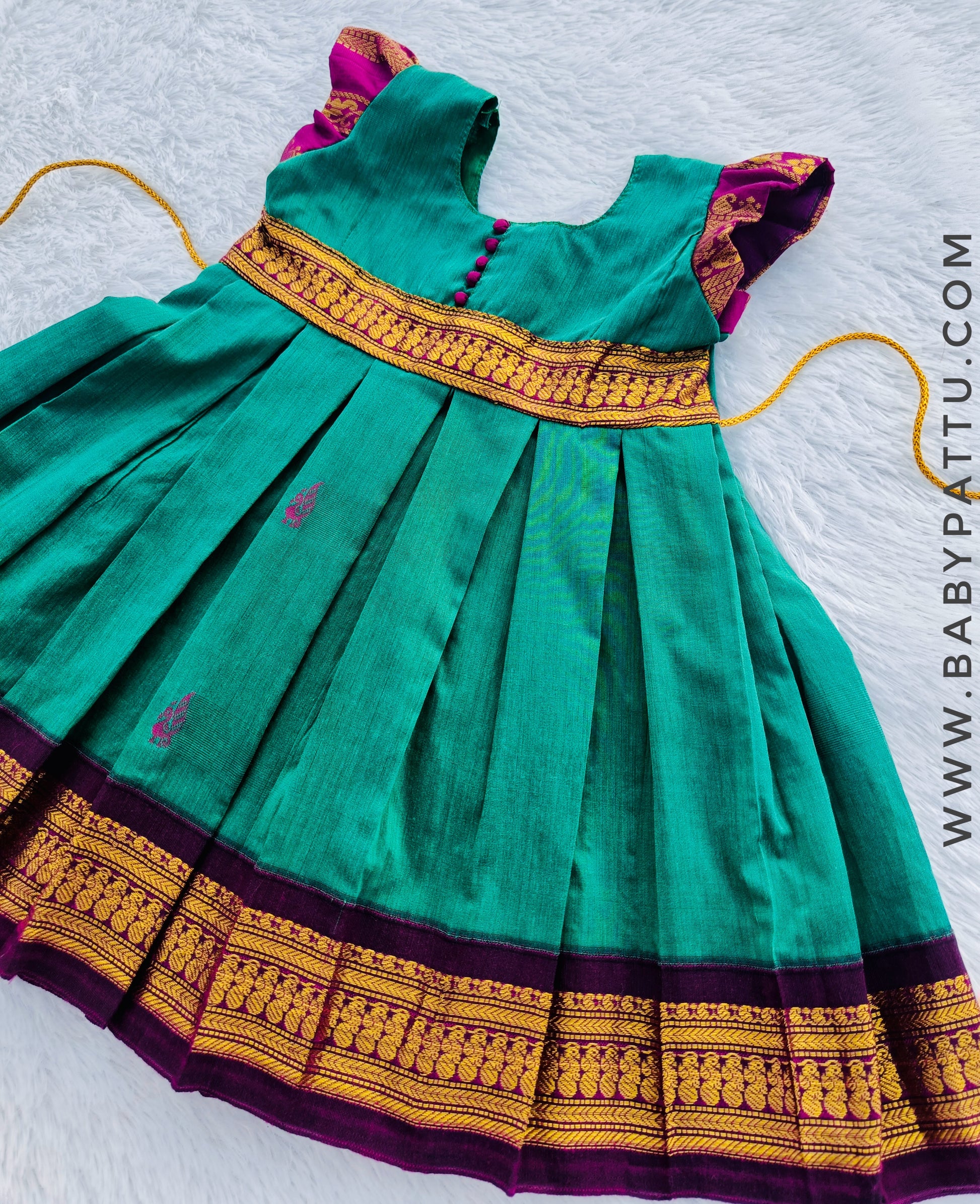 Pattu Pavadai is a traditional dress of South India. The paavadai or langa is a cone-shaped, long skirt that is pleated and tied around the waist, normally made of silk, that hangs down from the waist to the toes.