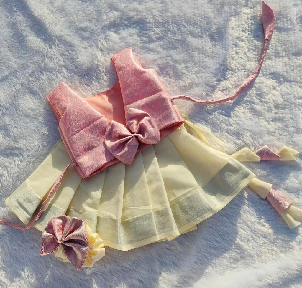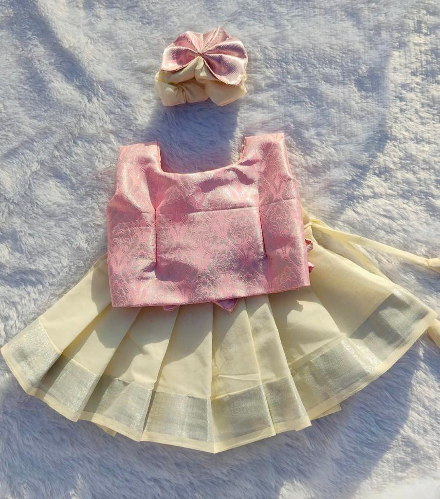Onam Collections - 2023 Baby Pink Top & White/Kasuvu Cotton Bottom Pattu Pavada
