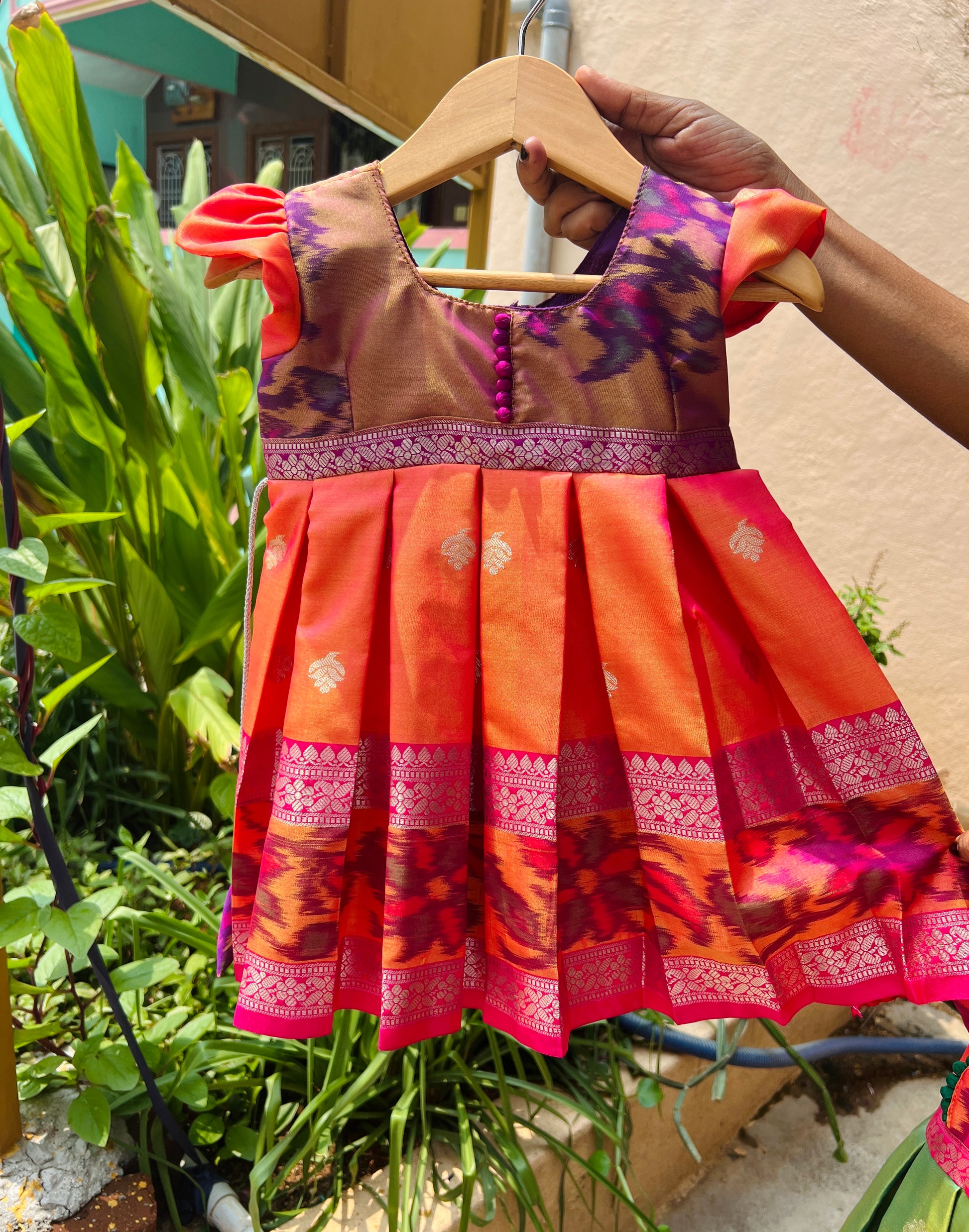 Pattu Pavadai is a traditional dress of South India. The paavadai or langa is a cone-shaped, long skirt that is pleated and tied around the waist, normally made of silk, that hangs down from the waist to the toes.