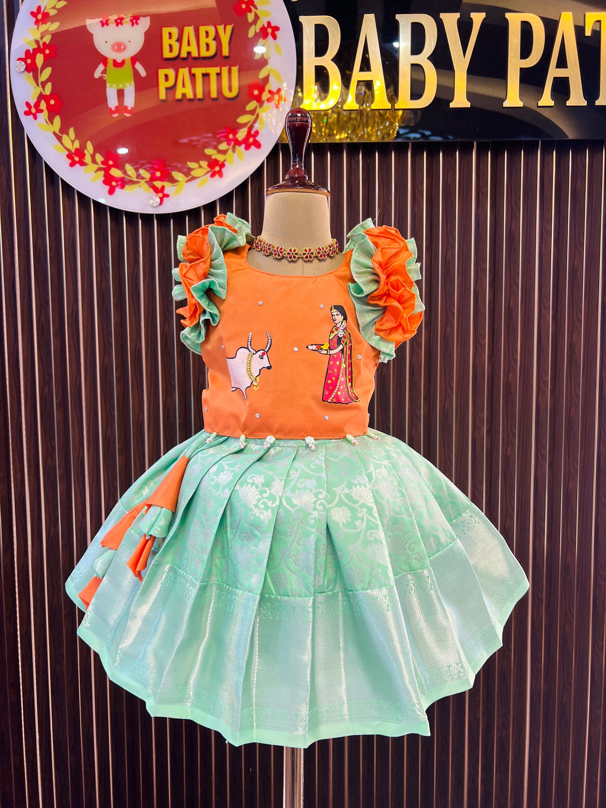 Orange Color Top And Mint Green Bottom Pattu Pavada - Pongal 2026 / Makara Sankranthi 2026 Collections