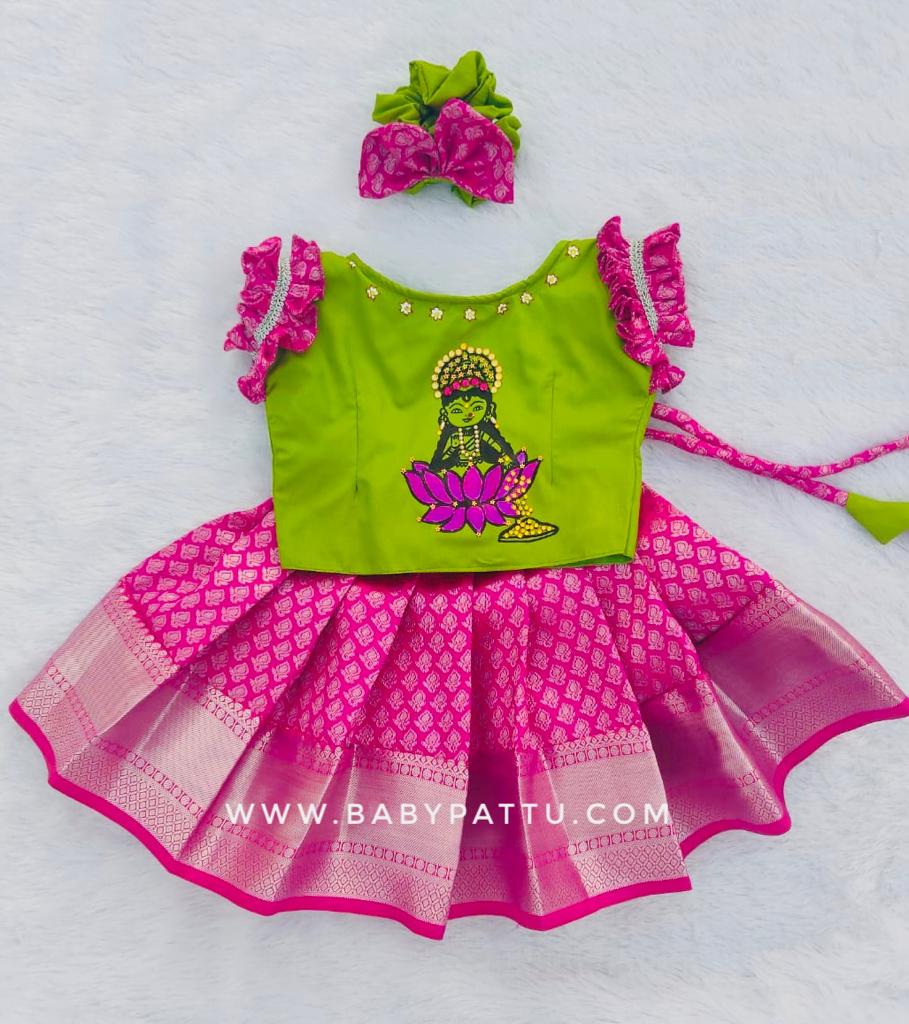 Pattu Pavadai is a traditional dress of South India. The paavadai or langa is a cone-shaped, long skirt that is pleated and tied around the waist, normally made of silk, that hangs down from the waist to the toes.