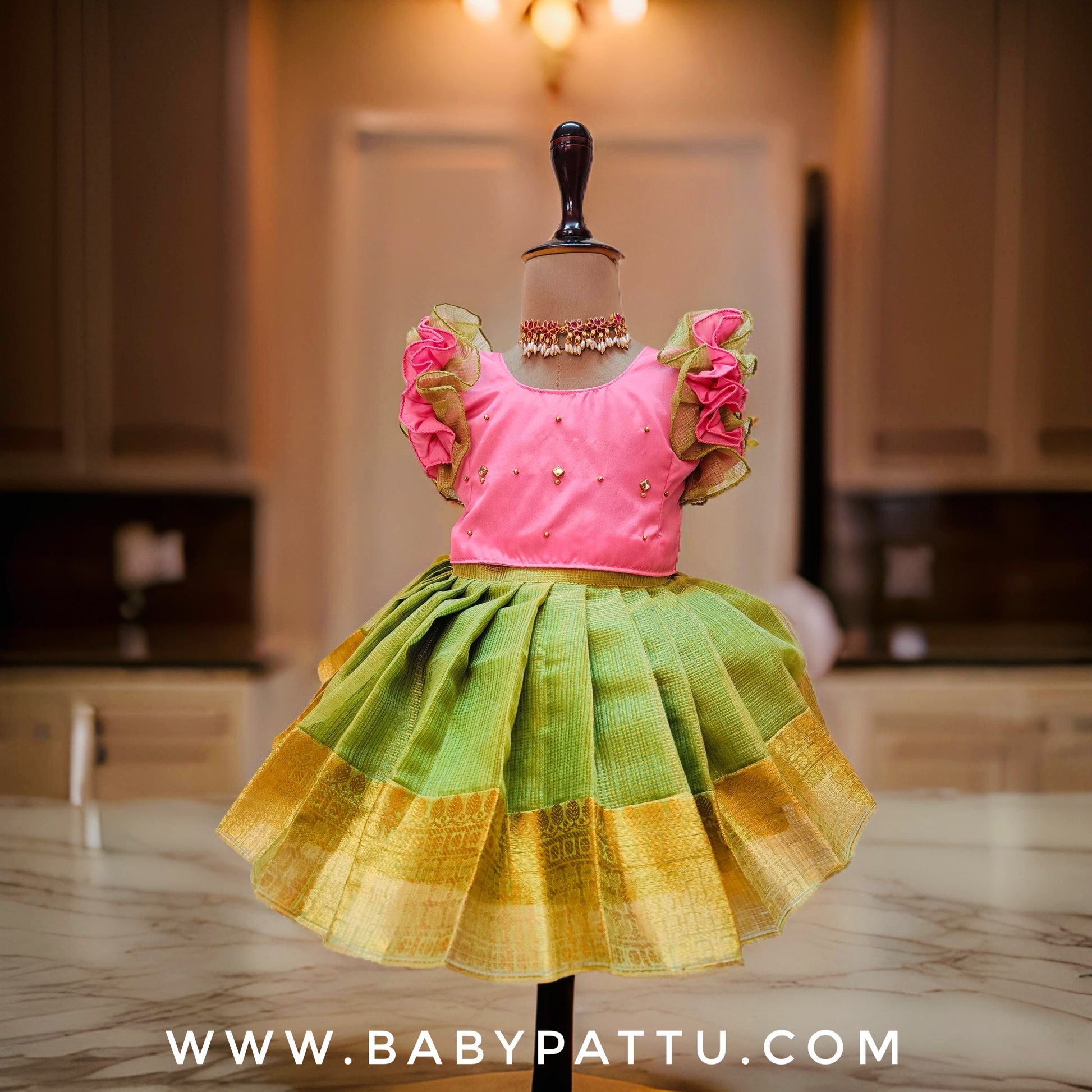 Pattu Pavadai is a traditional dress of South India. The paavadai or langa is a cone-shaped, long skirt that is pleated and tied around the waist, normally made of silk, that hangs down from the waist to the toes.