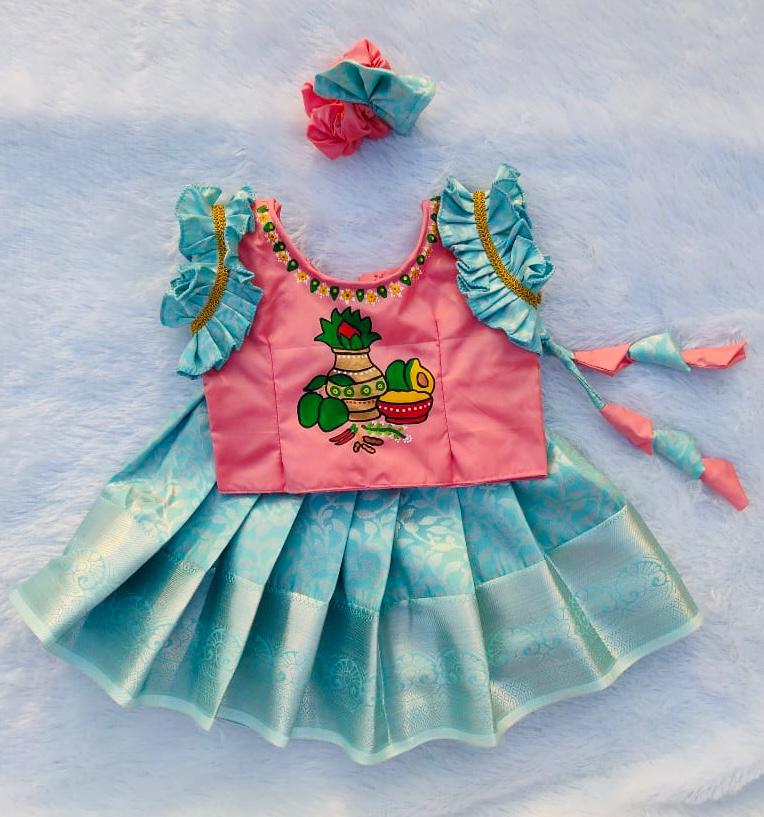 Pattu Pavadai is a traditional dress of South India. The paavadai or langa is a cone-shaped, long skirt that is pleated and tied around the waist, normally made of silk, that hangs down from the waist to the toes.
