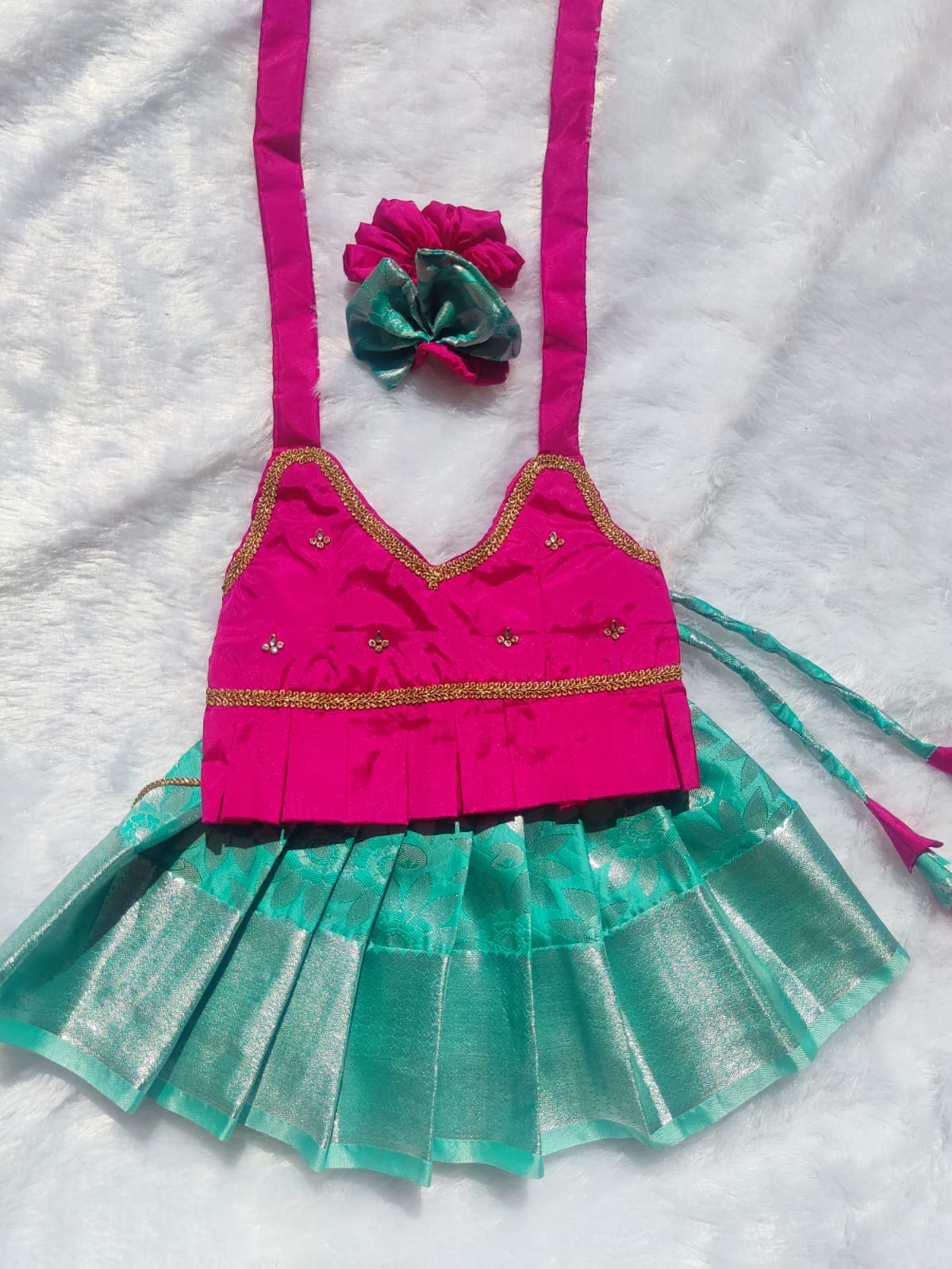 Pattu Pavadai is a traditional dress of South India. The paavadai or langa is a cone-shaped, long skirt that is pleated and tied around the waist, normally made of silk, that hangs down from the waist to the toes.