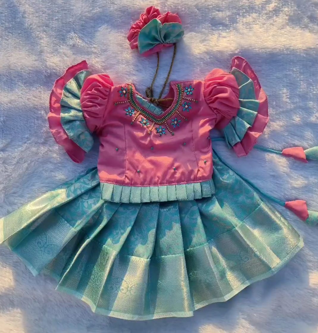 Pattu Pavadai is a traditional dress of South India. The paavadai or langa is a cone-shaped, long skirt that is pleated and tied around the waist, normally made of silk, that hangs down from the waist to the toes.