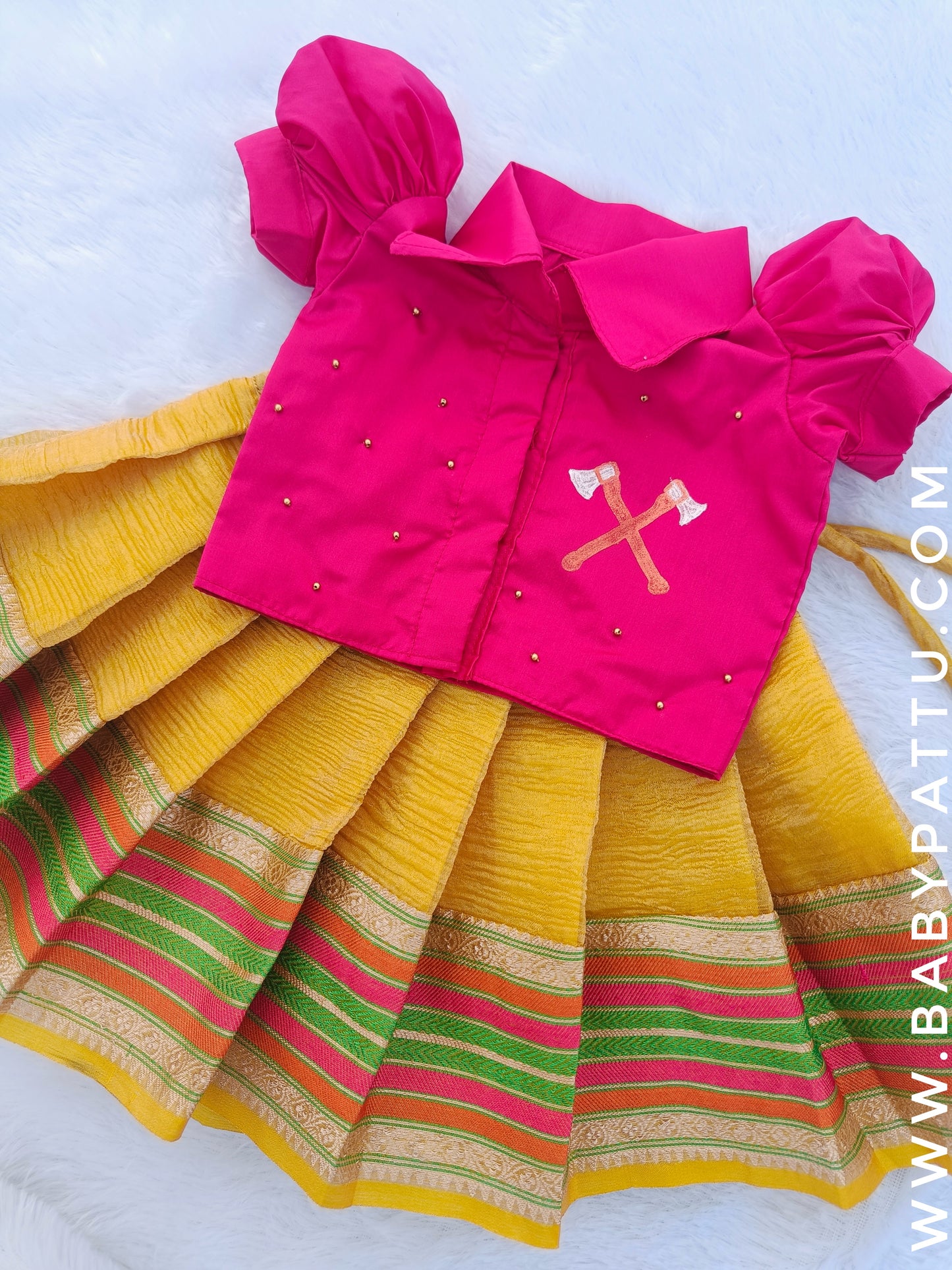 Pattu Pavadai is a traditional dress of South India. The paavadai or langa is a cone-shaped, long skirt that is pleated and tied around the waist, normally made of silk, that hangs down from the waist to the toes.