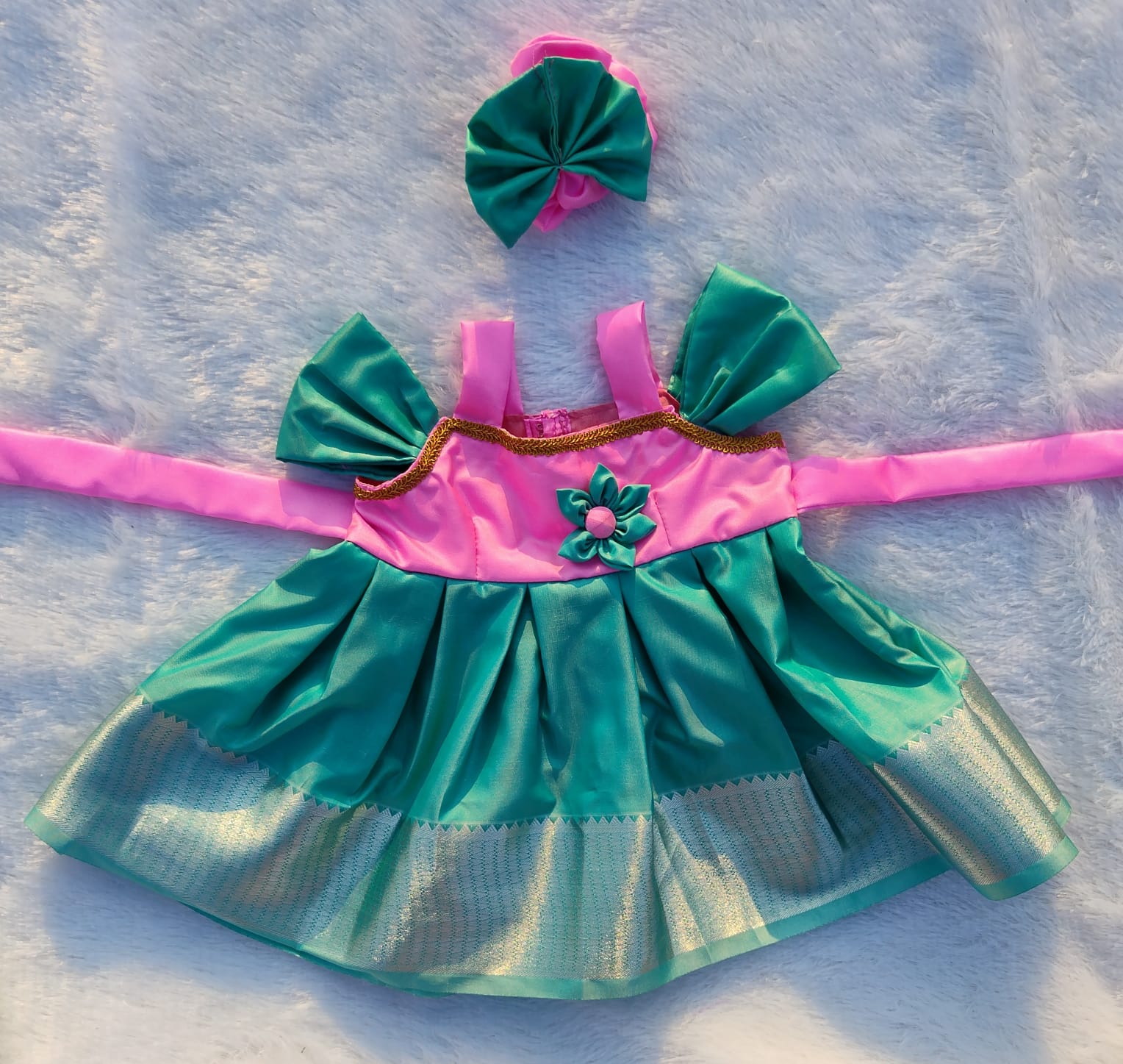 Pattu Pavadai is a traditional dress of South India. The paavadai or langa is a cone-shaped, long skirt that is pleated and tied around the waist, normally made of silk, that hangs down from the waist to the toes.