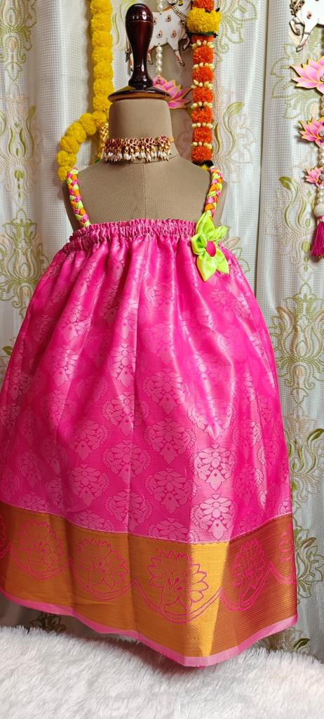 Pattu Pavadai is a traditional dress of South India. The paavadai or langa is a cone-shaped, long skirt that is pleated and tied around the waist, normally made of silk, that hangs down from the waist to the toes.