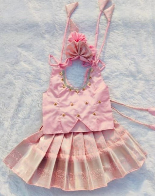 Pattu Pavadai is a traditional dress of South India. The paavadai or langa is a cone-shaped, long skirt that is pleated and tied around the waist, normally made of silk, that hangs down from the waist to the toes.