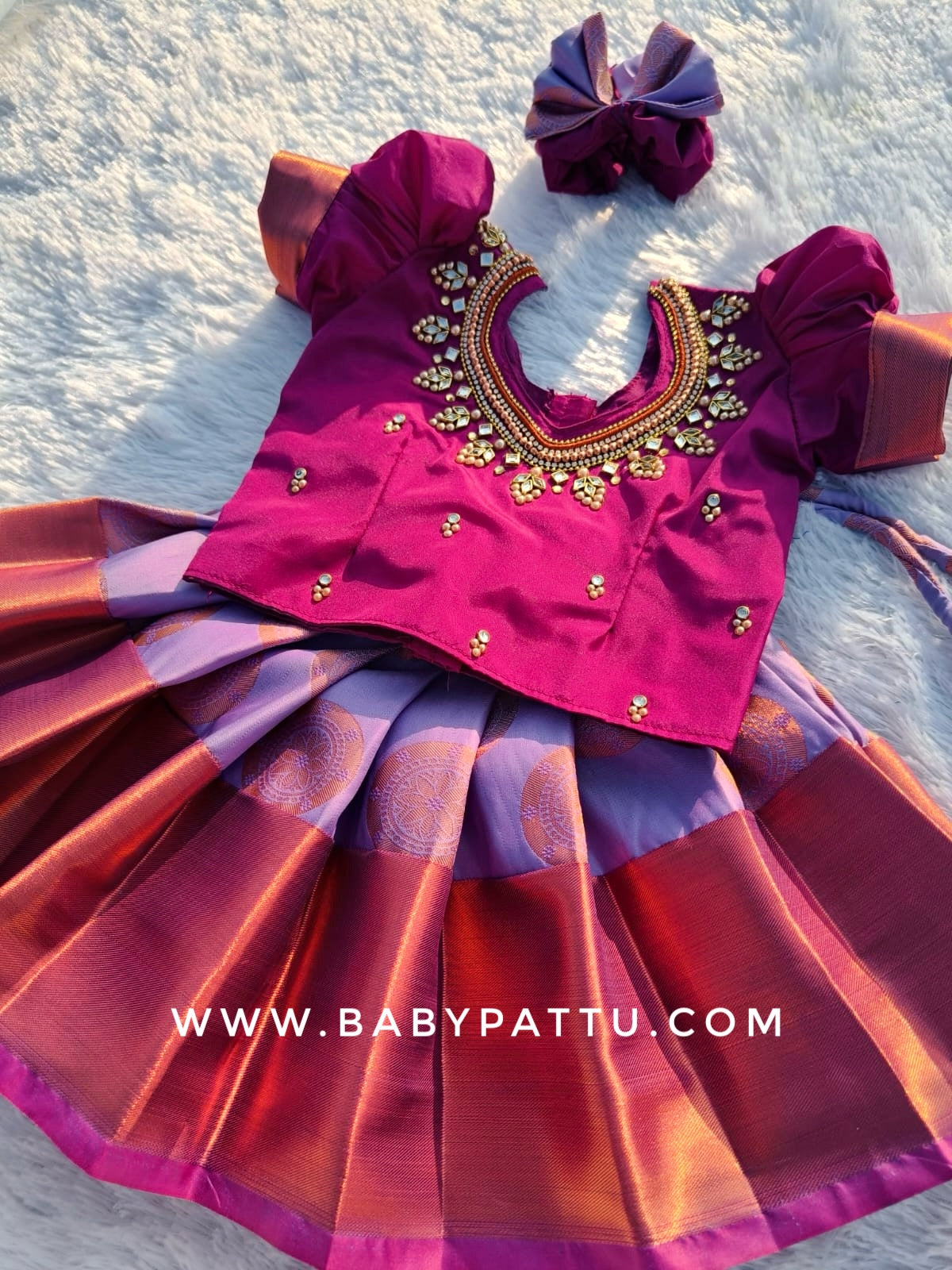 Pattu Pavadai is a traditional dress of South India. The paavadai or langa is a cone-shaped, long skirt that is pleated and tied around the waist, normally made of silk, that hangs down from the waist to the toes.