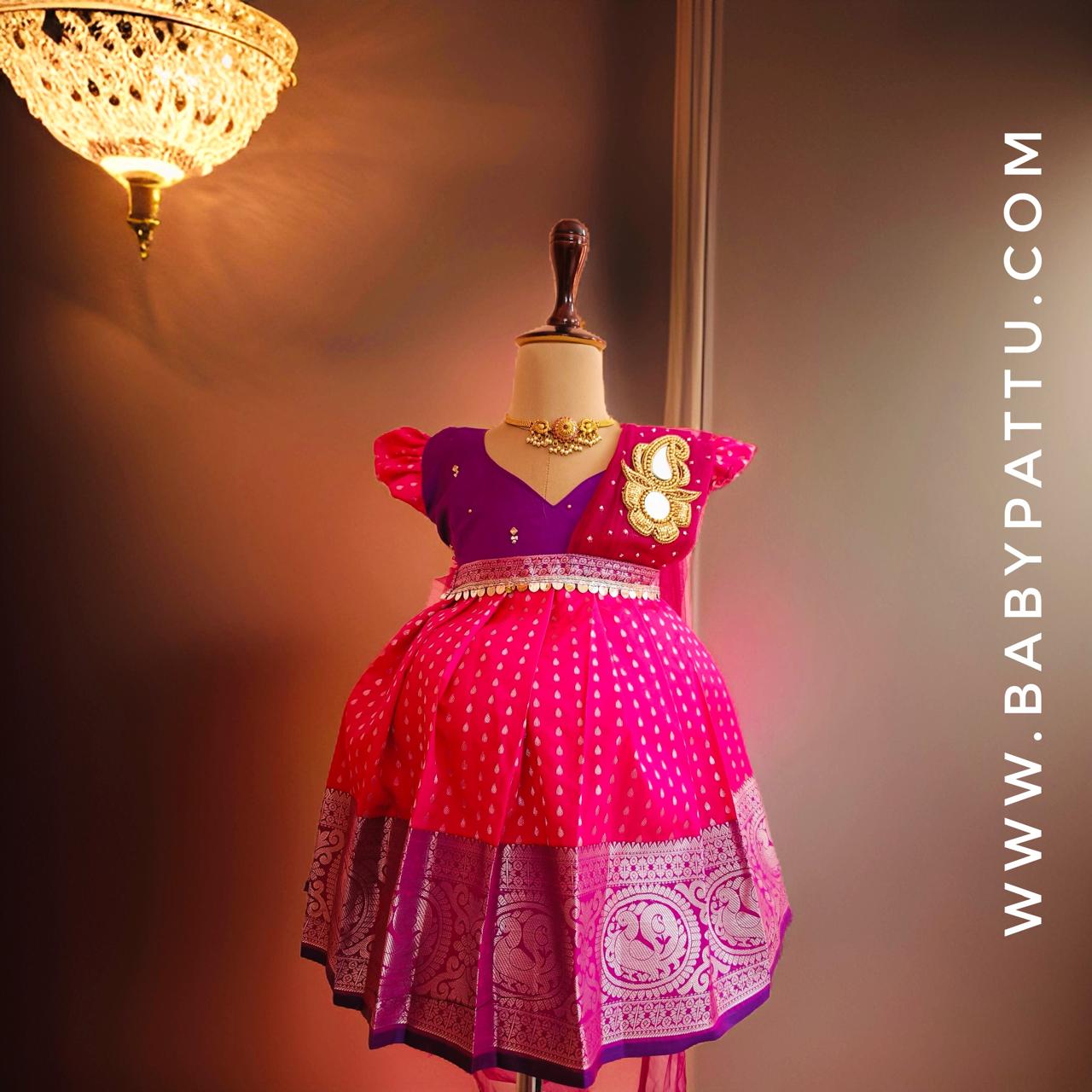 Pattu Pavadai is a traditional dress of South India. The paavadai or langa is a cone-shaped, long skirt that is pleated and tied around the waist, normally made of silk, that hangs down from the waist to the toes.