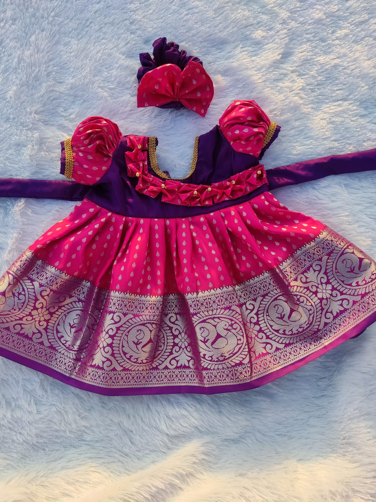 Pattu Pavadai is a traditional dress of South India. The paavadai or langa is a cone-shaped, long skirt that is pleated and tied around the waist, normally made of silk, that hangs down from the waist to the toes.