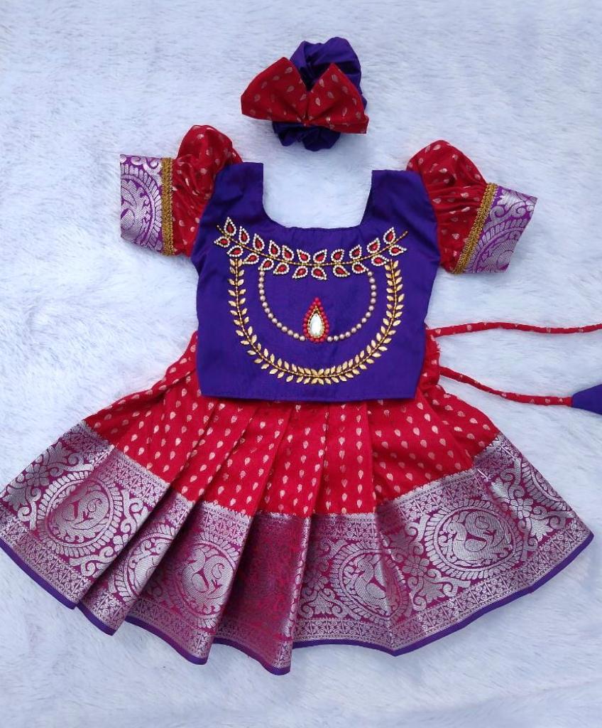 Pattu Pavadai is a traditional dress of South India. The paavadai or langa is a cone-shaped, long skirt that is pleated and tied around the waist, normally made of silk, that hangs down from the waist to the toes.