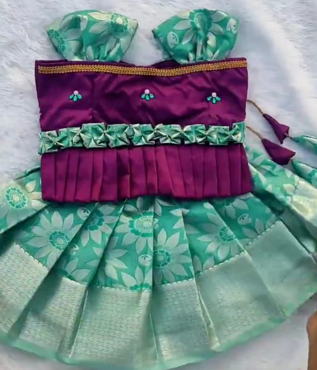Pattu Pavadai is a traditional dress of South India. The paavadai or langa is a cone-shaped, long skirt that is pleated and tied around the waist, normally made of silk, that hangs down from the waist to the toes.