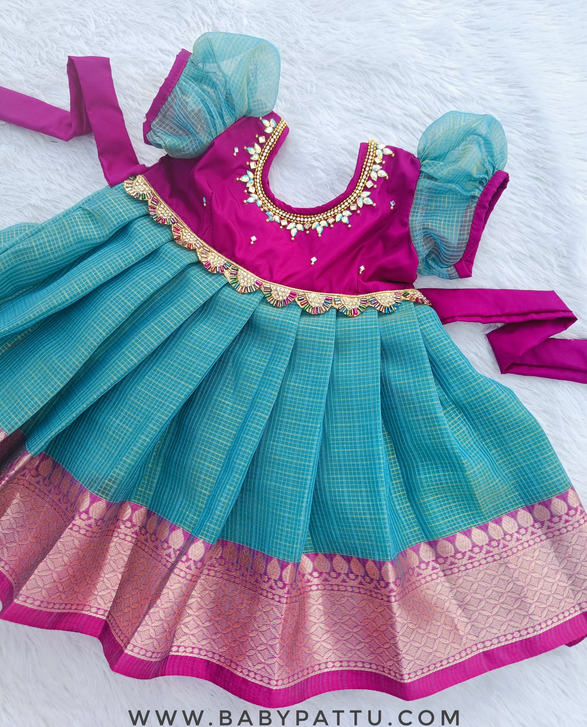 Pattu Pavadai is a traditional dress of South India. The paavadai or langa is a cone-shaped, long skirt that is pleated and tied around the waist, normally made of silk, that hangs down from the waist to the toes.