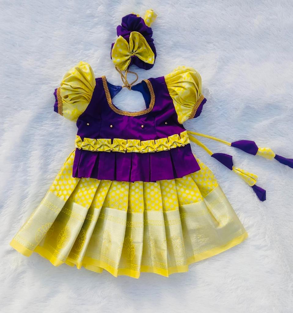 Pattu Pavadai is a traditional dress of South India. The paavadai or langa is a cone-shaped, long skirt that is pleated and tied around the waist, normally made of silk, that hangs down from the waist to the toes.