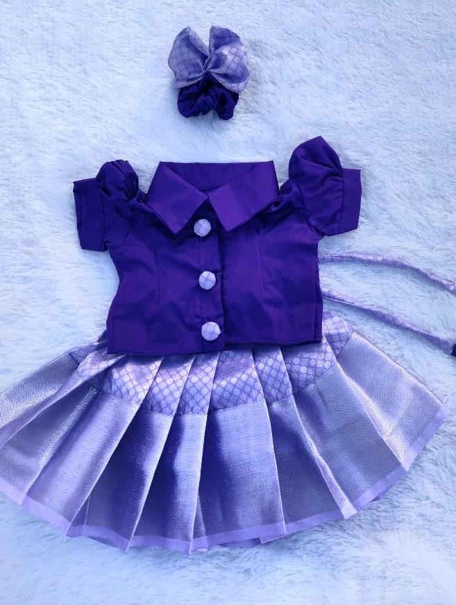 Pattu Pavadai is a traditional dress of South India. The paavadai or langa is a cone-shaped, long skirt that is pleated and tied around the waist, normally made of silk, that hangs down from the waist to the toes.