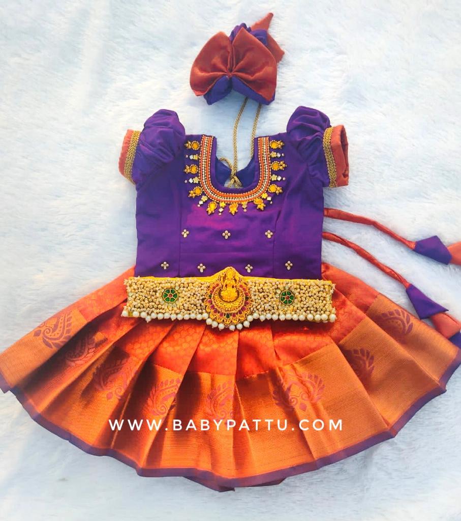 Pattu Pavadai is a traditional dress of South India. The paavadai or langa is a cone-shaped, long skirt that is pleated and tied around the waist, normally made of silk, that hangs down from the waist to the toes.
