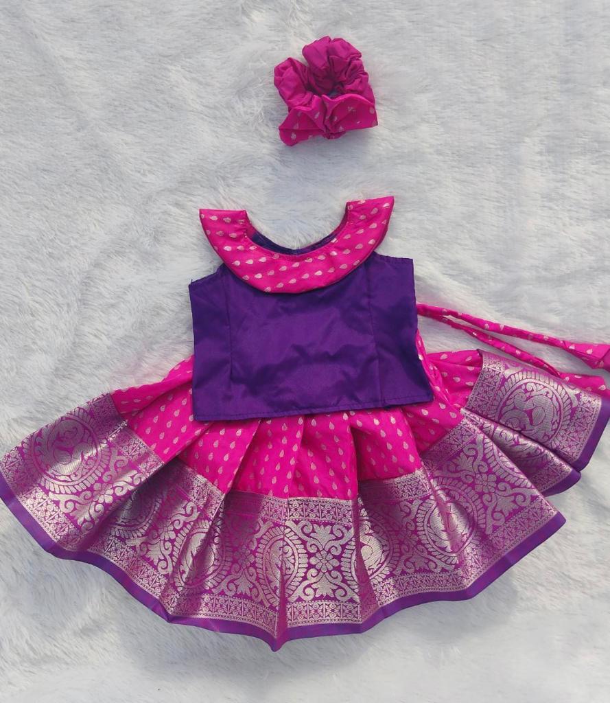 Pattu Pavadai is a traditional dress of South India. The paavadai or langa is a cone-shaped, long skirt that is pleated and tied around the waist, normally made of silk, that hangs down from the waist to the toes.