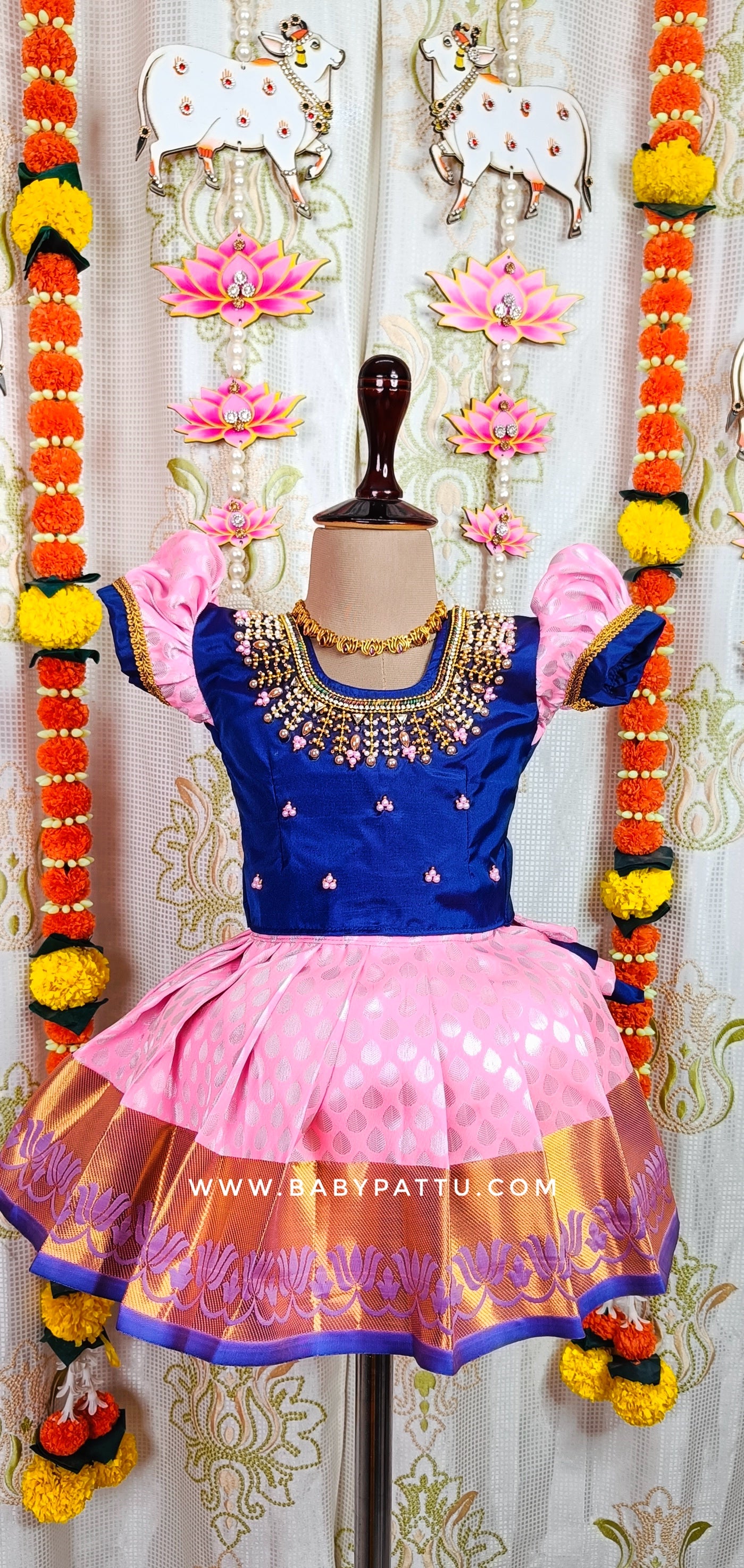 Pattu Pavadai is a traditional dress of South India. The paavadai or langa is a cone-shaped, long skirt that is pleated and tied around the waist, normally made of silk, that hangs down from the waist to the toes.