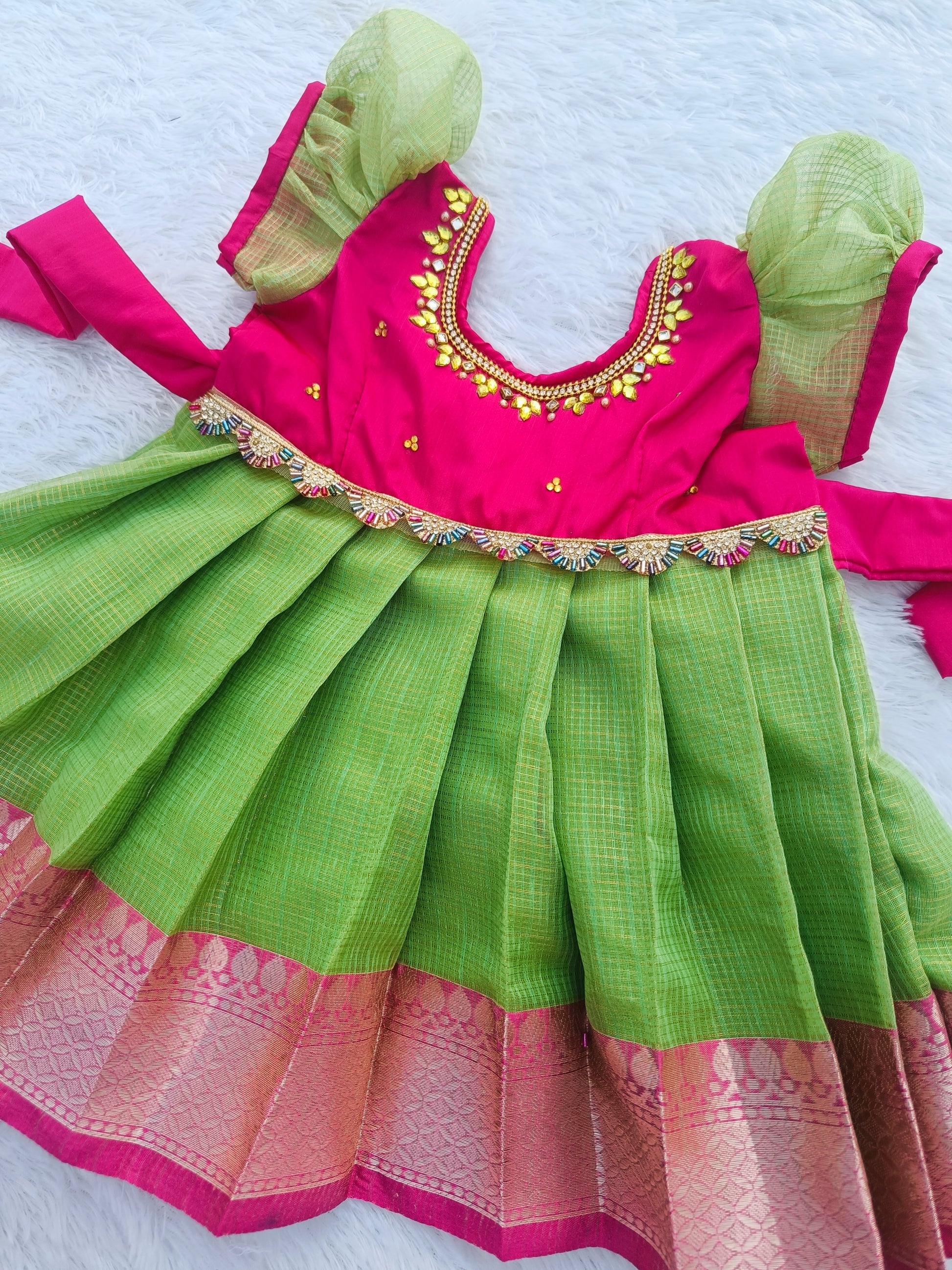 Pattu Pavadai is a traditional dress of South India. The paavadai or langa is a cone-shaped, long skirt that is pleated and tied around the waist, normally made of silk, that hangs down from the waist to the toes.