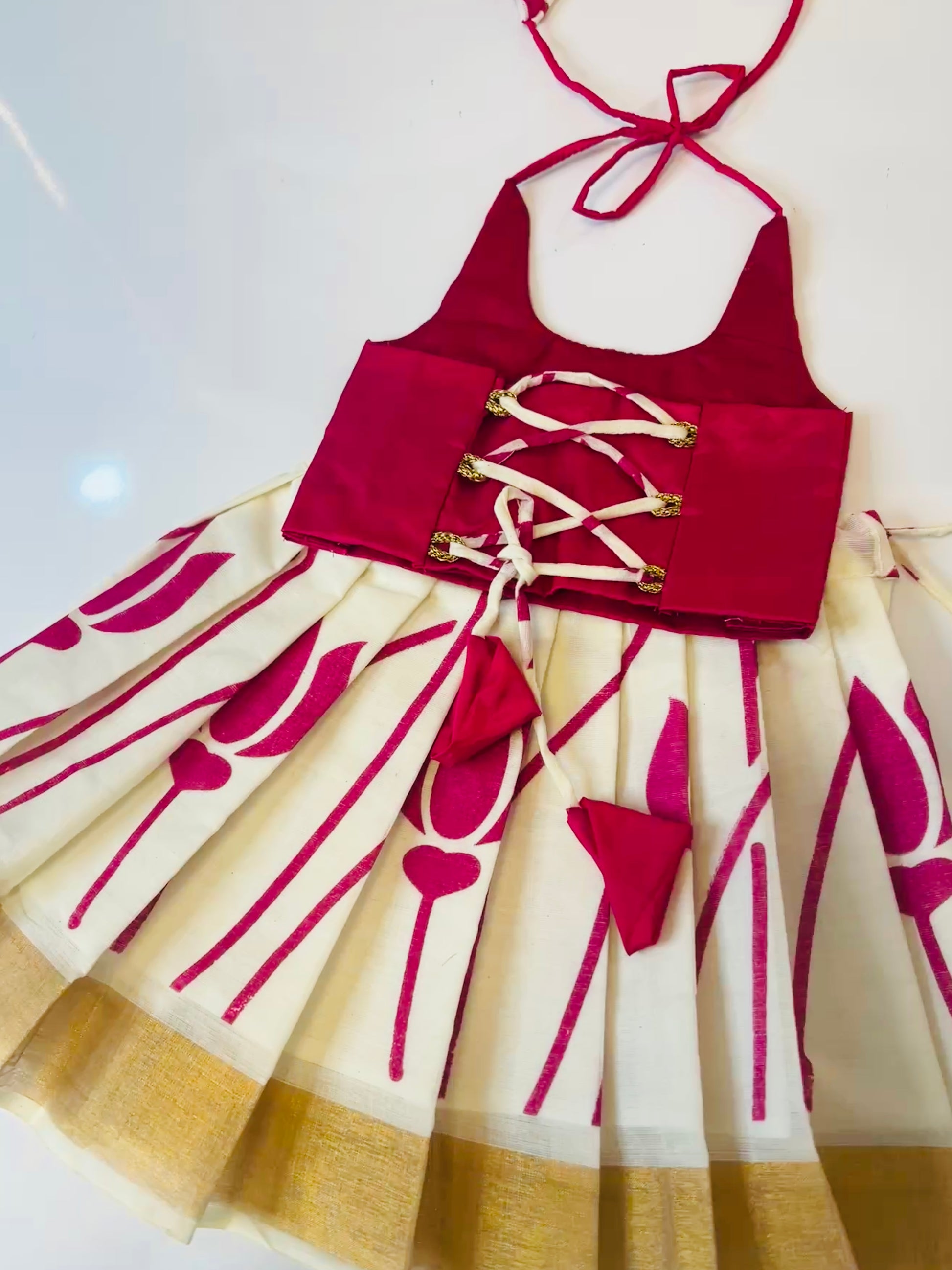 Rani Pink Color Crop Top And Kerala Cotton Bottom Pattu Pavada Onam 2025 collections