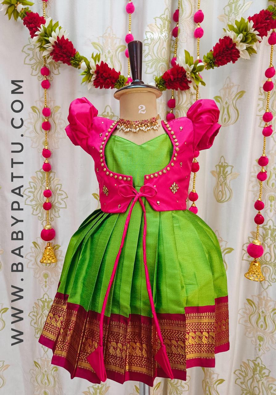 Pattu Pavadai is a traditional dress of South India. The paavadai or langa is a cone-shaped, long skirt that is pleated and tied around the waist, normally made of silk, that hangs down from the waist to the toes.