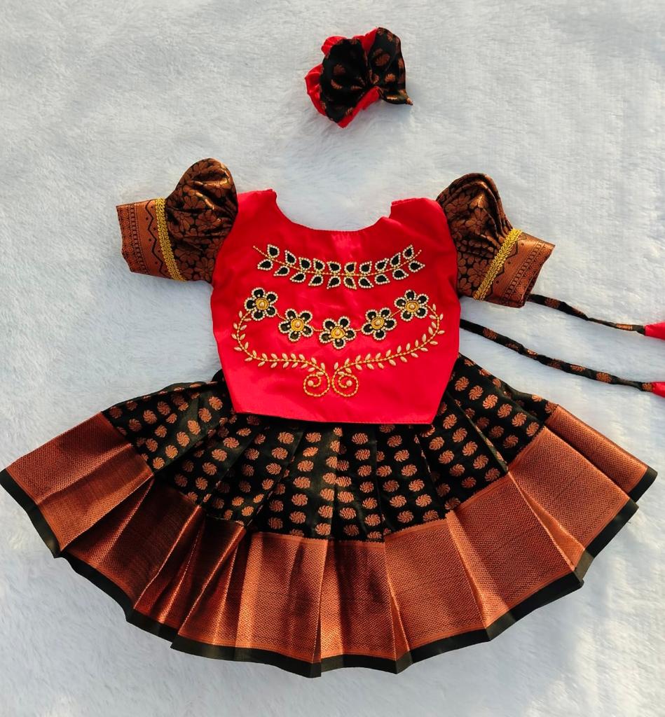 Pattu Pavadai is a traditional dress of South India. The paavadai or langa is a cone-shaped, long skirt that is pleated and tied around the waist, normally made of silk, that hangs down from the waist to the toes.